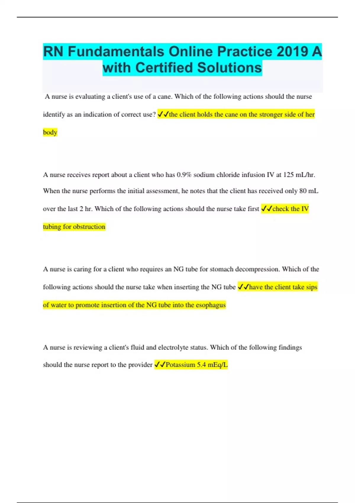 A nurse is evaluating a client's use of a cane. Which of the following actions should the nurse identify as an indication of correct use? the client holds the cane on the stronger side of her body A nurse receives report about a client who has 0.9% sodium chloride infusion IV at 125 mL/hr. When the nurse performs the initial assessment, he notes that the client has received only 80 mL over the last 2 hr. Which of the following actions should the nurse take first check the IV tubing for obstruction A nurse is caring for a client who requires an NG tube for stomach decompression. Which of the following actions should the nurse take when inserting the NG tube have the client take sips of water to promote insertion of the NG tube into the esophagus A nurse is reviewing a client's fluid and electrolyte status. Which of the following findings should the nurse report to the provider Potassium 5.4 mEq/L