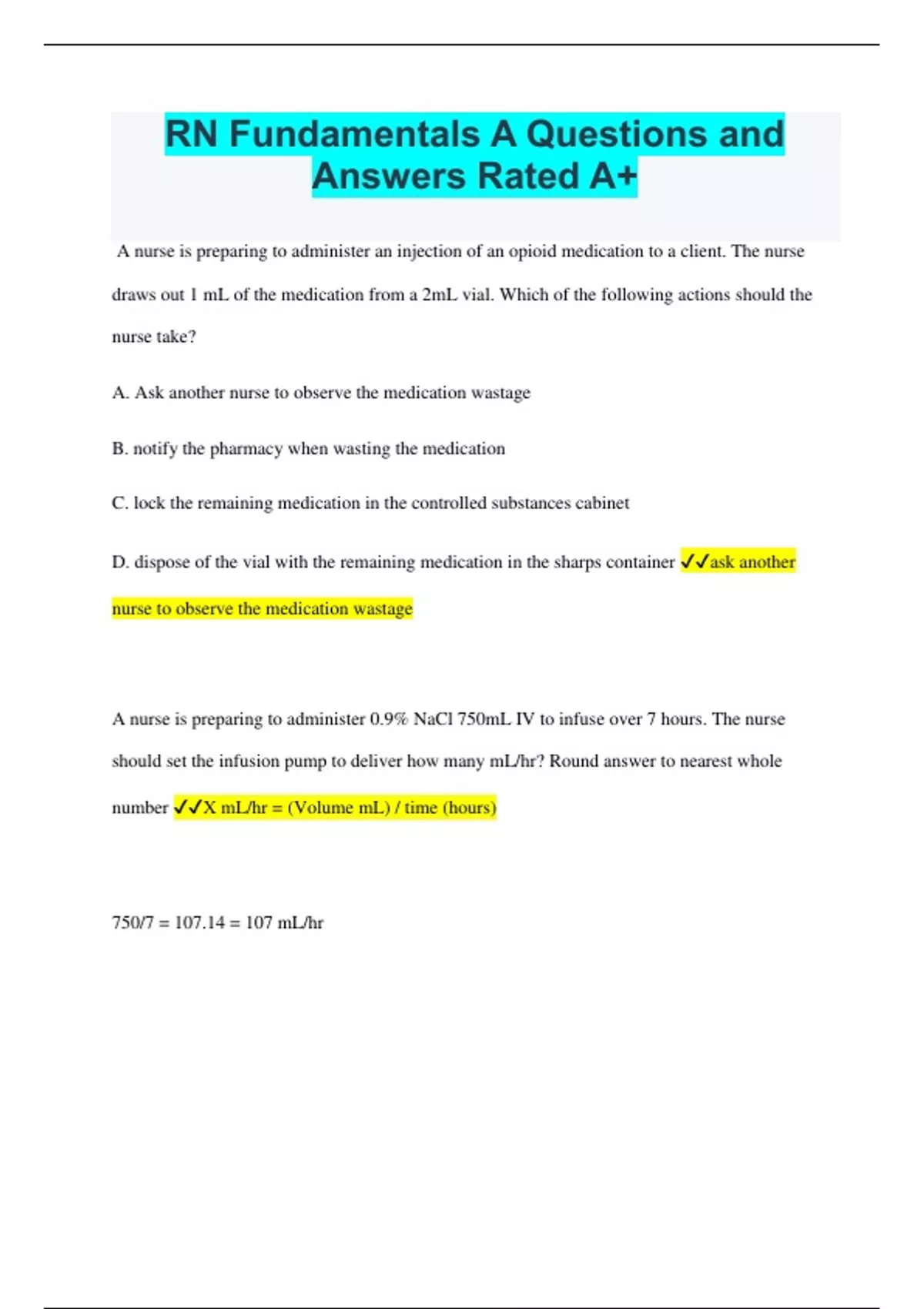 A nurse is preparing to administer an injection of an opioid medication to a client. The nurse draws out 1 mL of the medication from a 2mL vial. Which of the following actions should the nurse take? A. Ask another nurse to observe the medication wastage B. notify the pharmacy when wasting the medication C. lock the remaining medication in the controlled substances cabinet D. dispose of the vial with the remaining medication in the sharps container ask another nurse to observe the medication wastage A nurse is preparing to administer 0.9% NaCl 750mL IV to infuse over 7 hours. The nurse should set the infusion pump to deliver how many mL/hr? Round answer to nearest whole number X mL/hr = (Volume mL) / time (hours)