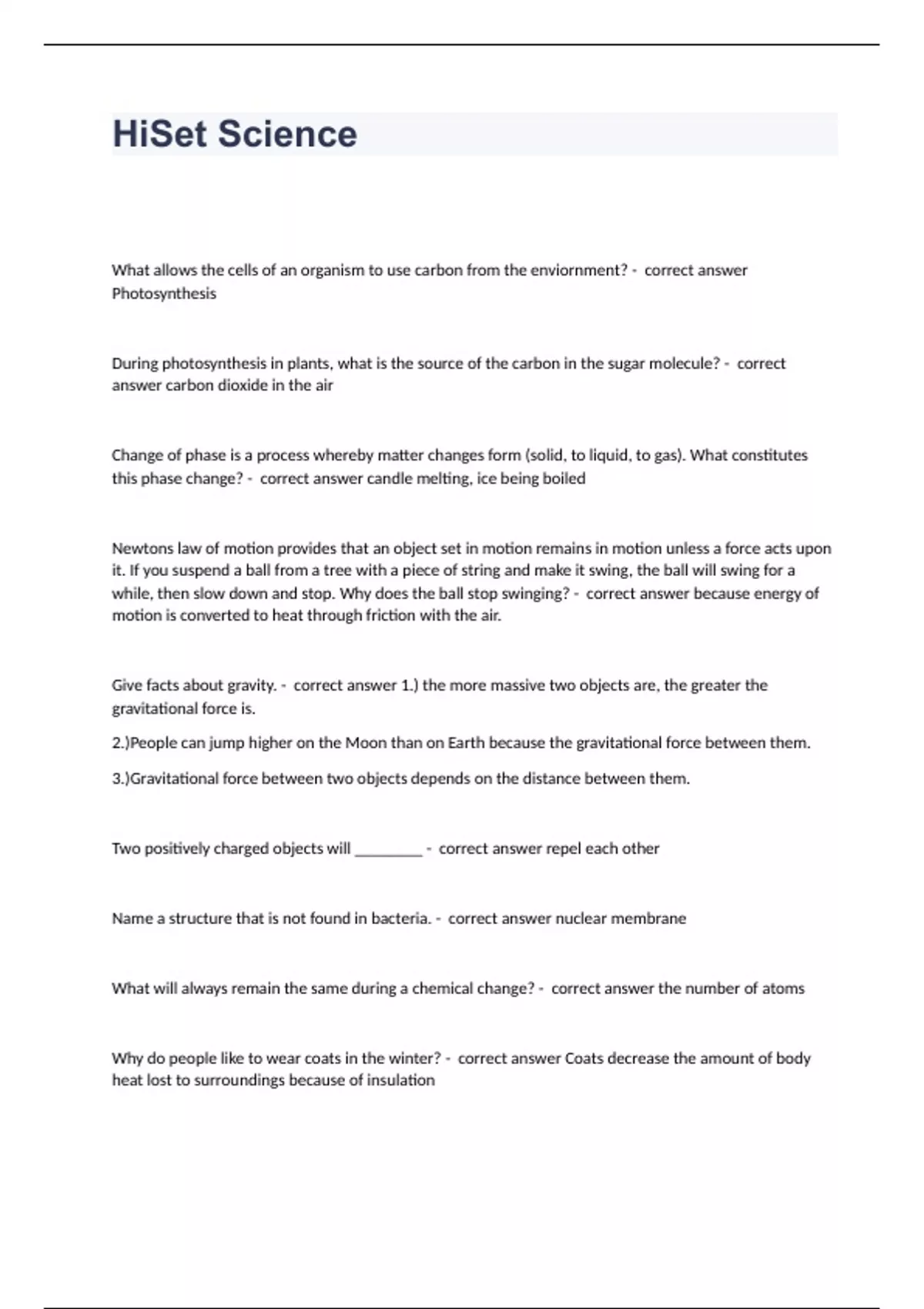 HiSet Science Question and answers correctly solved 2024/2025 UPDATED