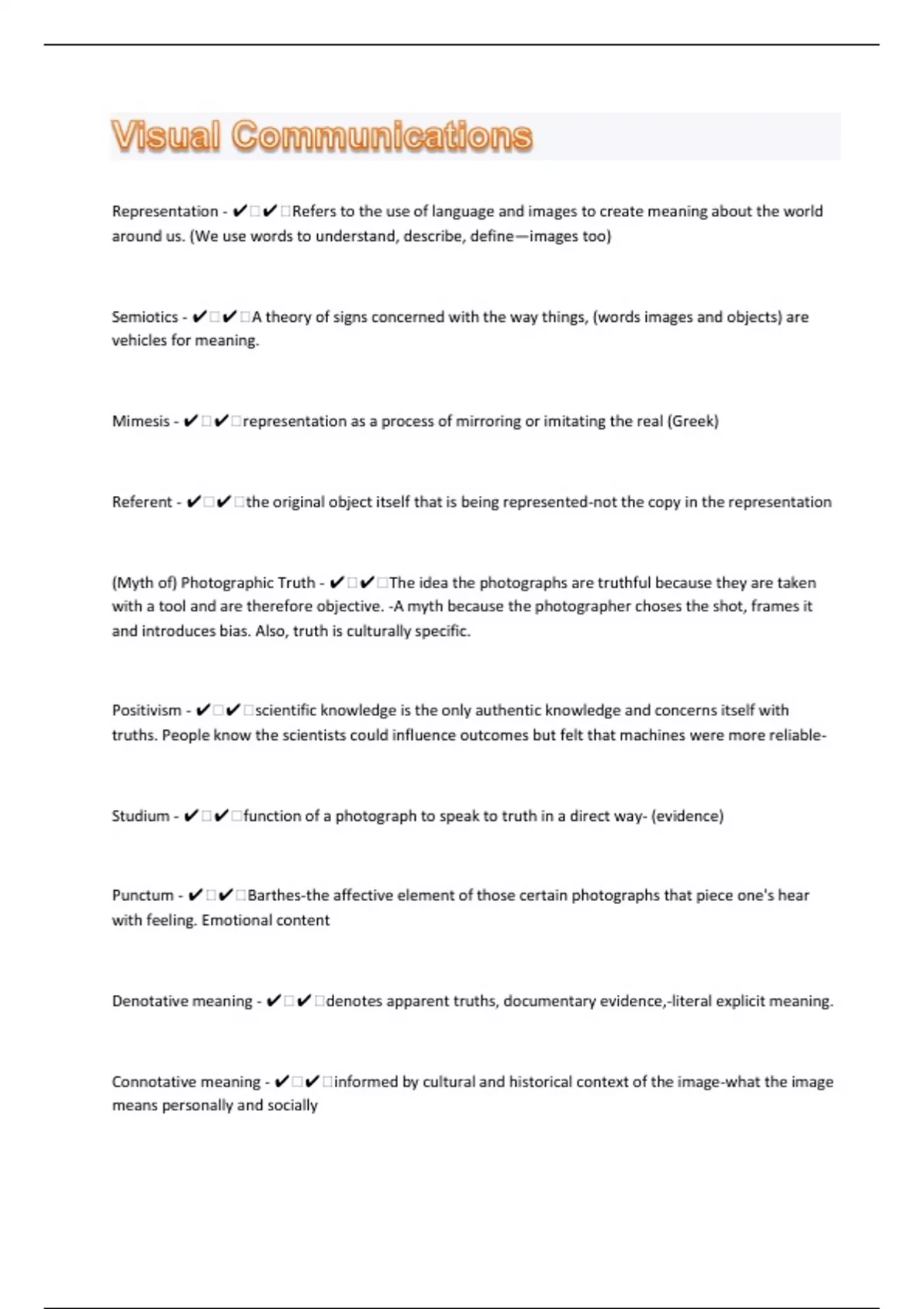Representation - ️️Refers to the use of language and images to create meaning about the world around us. (We use words to understand, describe, define—images too) Semiotics - ️️A theory of signs concerned with the way things, (words images and objects) are vehicles for meaning. Mimesis - ️️representation as a process of mirroring or imitating the real (Greek) Referent - ️️the original object itself that is being represented-not the copy in the representation (Myth of) Photographic Truth - ️️The idea the photographs are truthful because they are taken with a tool and are therefore objective. -A myth because the photographer choses the shot, frames it and introduces bias. Also, truth is culturally specific. Positivism - ️️scientific knowledge is the only authentic knowledge and concerns itself with truths. People know the scientists could influence outcomes but felt that machines were more reliable- Studium - ️️function of a photograph to speak to truth in a direct way- (evidence) Punctum - ️️Barthes-the affective element of those certain photographs that piece one's hear with feeling. Emotional content Denotative meaning - ️️denotes apparent truths, documentary evidence,-literal explicit meaning. Connotative meaning - ️️informed by cultural and historical context of the image-what the image means personally and socially