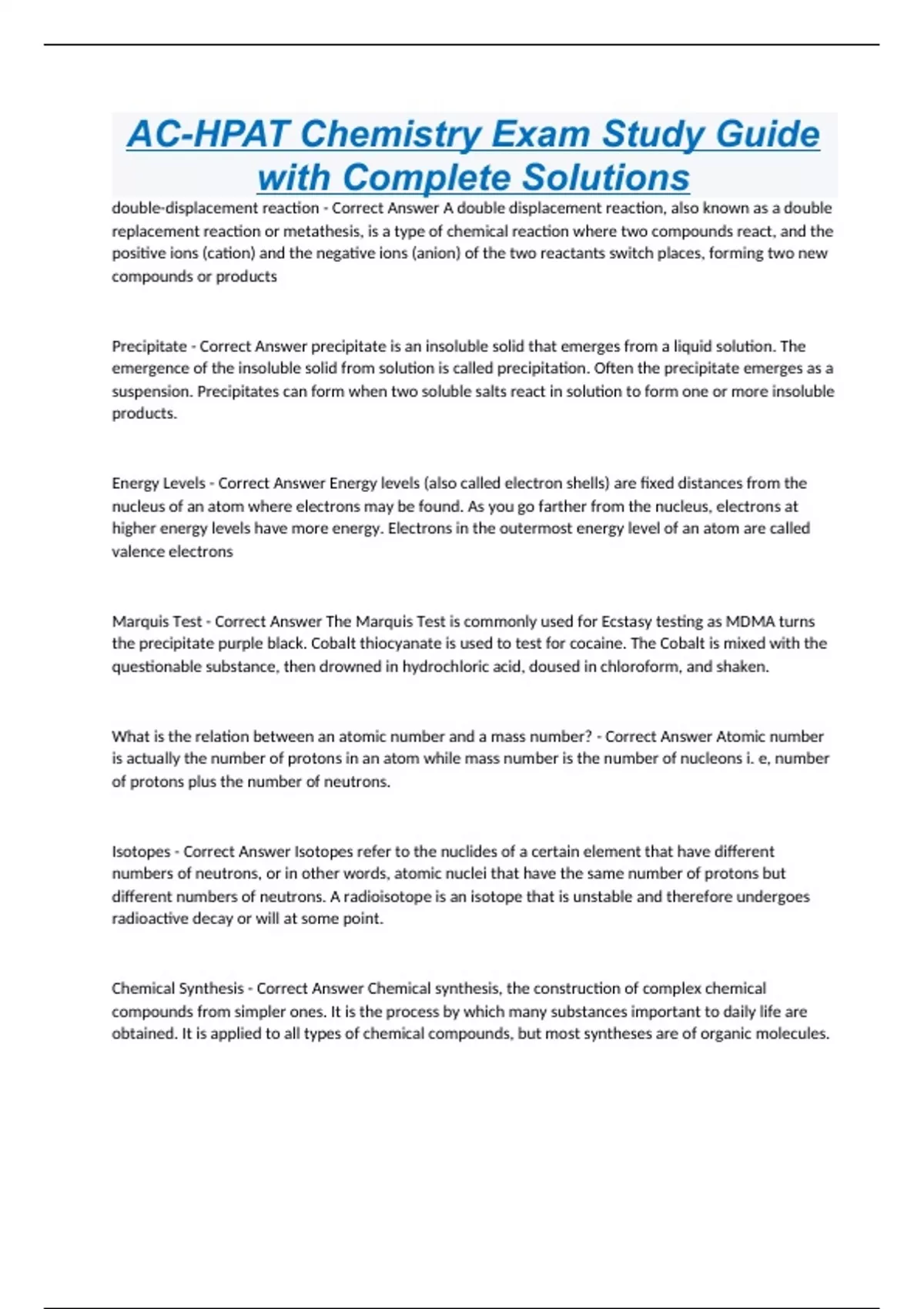 AC-HPAT Chemistry Exam Study Guide with Complete Solutions double-displacement reaction - Correct Answer A double displacement reaction, also known as a double replacement reaction or metathesis, is a type of chemical reaction where two compounds react, and the positive ions (cation) and the negative ions (anion) of the two reactants switch places, forming two new compounds or products Precipitate - Correct Answer precipitate is an insoluble solid that emerges from a liquid solution. The emergence of the insoluble solid from solution is called precipitation. Often the precipitate emerges as a suspension. Precipitates can form when two soluble salts react in solution to form one or more insoluble products. Energy Levels - Correct Answer Energy levels (also called electron shells) are fixed distances from the nucleus of an atom where electrons may be found. As you go farther from the nucleus, electrons at higher energy levels have more energy. Electrons in the outermost energy level of an atom are called valence electrons Marquis Test - Correct Answer The Marquis Test is commonly used for Ecstasy testing as MDMA turns the precipitate purple black. Cobalt thiocyanate is used to test for cocaine. The Cobalt is mixed with the questionable substance, then drowned in hydrochloric acid, doused in chloroform, and shaken. What is the relation between an atomic number and a mass number? - Correct Answer Atomic number is actually the number of protons in an atom while mass number is the number of nucleons i. e, number of protons plus the number of neutrons. Isotopes - Correct Answer Isotopes refer to the nuclides of a certain element that have different numbers of neutrons, or in other words, atomic nuclei that have the same number of protons but different numbers of neutrons. A radioisotope is an isotope that is unstable and therefore undergoes radioactive decay or will at some point. Chemical Synthesis - Correct Answer Chemical synthesis, the construction of complex chemical compounds from simpler ones. It is the process by which many substances important to daily life are