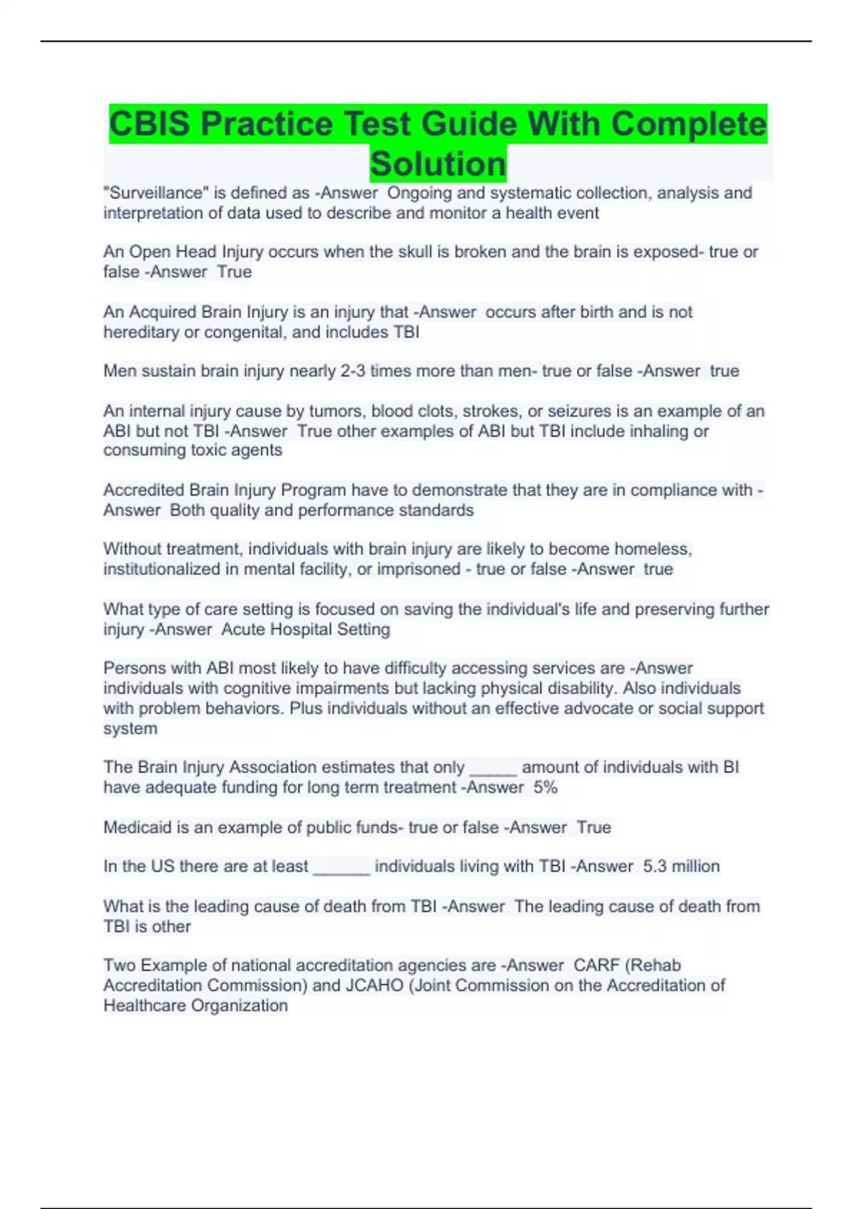"Surveillance" is defined as -Answer Ongoing and systematic collection, analysis and interpretation of data used to describe and monitor a health event An Open Head Injury occurs when the skull is broken and the brain is exposed- true or false -Answer True An Acquired Brain Injury is an injury that -Answer occurs after birth and is not hereditary or congenital, and includes TBI Men sustain brain injury nearly 2-3 times more than men- true or false -Answer true An internal injury cause by tumors, blood clots, strokes, or seizures is an example of an ABI but not TBI -Answer True other examples of ABI but TBI include inhaling or consuming toxic agents Accredited Brain Injury Program have to demonstrate that they are in compliance with -Answer Both quality and performance standards Without treatment, individuals with brain injury are likely to become homeless, institutionalized in mental facility, or imprisoned - true or false -Answer true What type of care setting is focused on saving the individual's life and preserving further injury -Answer Acute Hospital Setting Persons with ABI most likely to have difficulty accessing services are -Answer individuals with cognitive impairments but lacking physical disability. Also individuals with problem behaviors. Plus individuals without an effective advocate or social support system The Brain Injury Association estimates that only _____ amount of individuals with BI have adequate funding for long term treatment -Answer 5% Medicaid is an example of public funds- true or false -Answer True In the US there are at least ______ individuals living with TBI -Answer 5.3 million What is the leading cause of death from TBI -Answer The leading cause of death from TBI is other Two Example of national accreditation agencies are -Answer CARF (Rehab Accreditation Commission) and JCAHO (Joint Commission on the Accreditation of Healthcare Organization