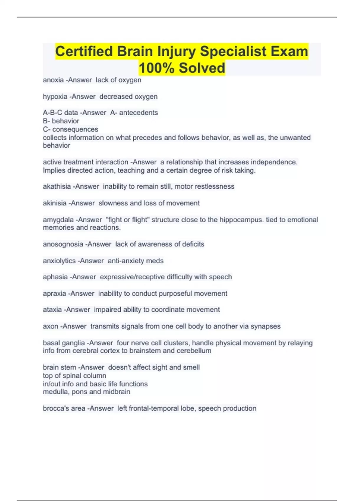 100% Solved anoxia -Answer lack of oxygen hypoxia -Answer decreased oxygen A-B-C data -Answer A- antecedents B- behavior C- consequences collects information on what precedes and follows behavior, as well as, the unwanted behavior active treatment interaction -Answer a relationship that increases independence. Implies directed action, teaching and a certain degree of risk taking. akathisia -Answer inability to remain still, motor restlessness akinisia -Answer slowness and loss of movement amygdala -Answer "fight or flight" structure close to the hippocampus. tied to emotional memories and reactions. anosognosia -Answer lack of awareness of deficits anxiolytics -Answer anti-anxiety meds aphasia -Answer expressive/receptive difficulty with speech apraxia -Answer inability to conduct purposeful movement ataxia -Answer impaired ability to coordinate movement axon -Answer transmits signals from one cell body to another via synapses basal ganglia -Answer four nerve cell clusters, handle physical movement by relaying info from cerebral cortex to brainstem and cerebellum brain stem -Answer doesn't affect sight and smell top of spinal column in/out info and basic life functions medulla, pons and midbrain brocca's area -Answer left frontal-temporal lobe, speech production brocca's aphasia -Answer dysarthric (broken) sp