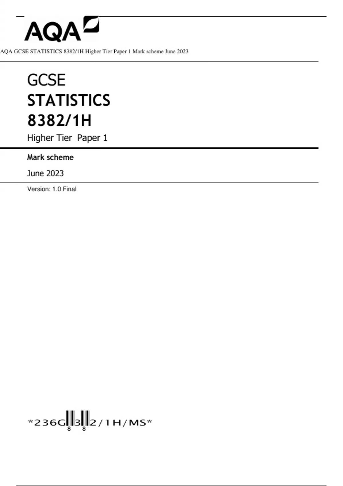 AQA GCSE STATISTICS 8382/1H Higher Tier Paper 1 Mark scheme June 2023