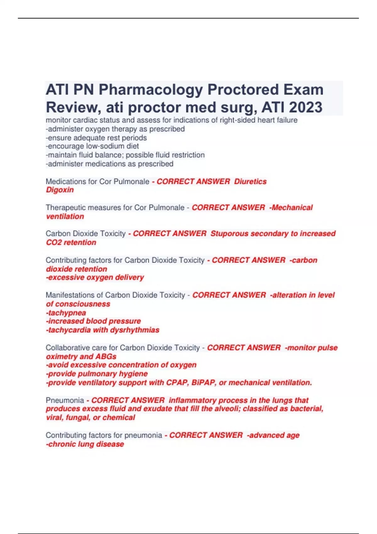 ATI PN Pharmacology Proctored Exam Review, ati proctor med surg, ATI 2023 monitor cardiac status and assess for indications of right-sided heart failure -administer oxygen therapy as prescribed -ensure adequate rest periods -encourage low-sodium diet -maintain fluid balance; possible fluid restriction -administer medications as prescribed Medications for Cor Pulmonale - CORRECT ANSWER Diuretics Digoxin Therapeutic measures for Cor Pulmonale - CORRECT ANSWER -Mechanical ventilation Carbon Dioxide Toxicity - CORRECT ANSWER Stuporous secondary to increased CO2 retention Contributing factors for Carbon Dioxide Toxicity - CORRECT ANSWER -carbon dioxide retention -excessive oxygen delivery Manifestations of Carbon Dioxide Toxicity - CORRECT ANSWER -alteration in level of consciousness -tachypnea -increased blood pressure -tachycardia with dysrhythmias Collaborative care for Carbon Dioxide Toxicity - CORRECT ANSWER -monitor pulse oximetry and ABGs -avoid excessive concentration of oxygen -provide pulmonary hygiene -provide ventilatory support with CPAP, BiPAP, or mechanical ventilation. Pneumonia - CORRECT ANSWER inflammatory process in the lungs that produces excess fluid and exudate that fill the alveoli; classified as bacterial, viral, fungal, or chemical Contributing factors for pneumonia - CORRECT ANSWER -advanced age -chronic lung disease -immunocompromised -mechanical ventilation -postoperative -sedation and opioid use -prolonged immobility -tobacco use -enteral tube feeding Manifestations of pneumonia - CORRECT ANSWER -tachypnea and tachycardia -sudden onset of chills, fever, flushing, diaphoresis -productive cough -dyspnea with pleuritic pain -crackles -elevated WBC -decreased O2 saturation Diagnostic procedures for pneumonia - CORRECT ANSWER -chest x-ray -pulse oximetry -sputum culture and sensitivity Nursing Interventions for penumonia - CORRECT ANSWER -assess respiratory status -administer oxygen -assess sputum -monitor vital signs -encourage 3 L of fluid per day -provide pulmonary hygiene -encourage mouth care -promote nutrition Medications for penumonia - CORRECT ANSWER -Anti-infectives (antibiotics) -antipyretics -bronchodilators -anti-inflammatories Client education for pneumonia - CORRECT ANSWER -medication administration -preventative measures -pneumonia and influenza vaccine Tuberculosis - CORRECT ANSWER an infectious disease caused by Mycobacterium tuberculosis and transmitted through aerosolization (airborne route). Contributing factors for TB - CORRECT ANSWER -older and homeless population -lower socioeconomic status -foreign immigrants -those in frequent contact with untreated persons -overcrowded living conditions Manifestations of TB - CORRECT ANSWER -cough, hypoptysis -positive sputum culture for acid-fast bacillus -low-grade fever with night sweats -anorexia, weight loss -malaise, fatigue