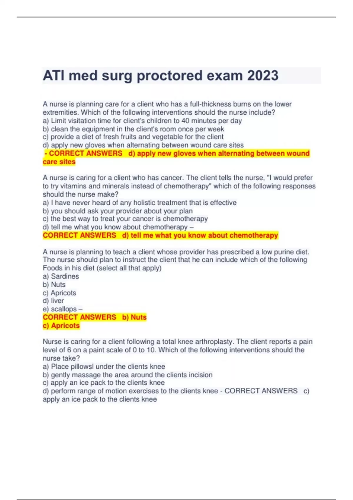 ATI med surg proctored exam 2023 A nurse is planning care for a client who has a full-thickness burns on the lower extremities. Which of the following interventions should the nurse include? a) Limit visitation time for client's children to 40 minutes per day b) clean the equipment in the client's room once per week c) provide a diet of fresh fruits and vegetable for the client d) apply new gloves when alternating between wound care sites - CORRECT ANSWERS d) apply new gloves when alternating between wound care sites A nurse is caring for a client who has cancer. The client tells the nurse, "I would prefer to try vitamins and minerals instead of chemotherapy" which of the following responses should the nurse make? a) I have never heard of any holistic treatment that is effective b) you should ask your provider about your plan c) the best way to treat your cancer is chemotherapy d) tell me what you know about chemotherapy – CORRECT ANSWERS d) tell me what you know about chemotherapy A nurse is planning to teach a client whose provider has prescribed a low purine diet. The nurse should plan to instruct the client that he can include which of the following Foods in his diet (select all that apply) a) Sardines b) Nuts c) Apricots d) liver e) scallops – CORRECT ANSWERS b) Nuts c) Apricots Nurse is caring for a client following a total knee arthroplasty. The client reports a pain level of 6 on a paint scale of 0 to 10. Which of the following interventions should the nurse take? a) Place pillowsl under the clients knee b) gently massage the area around the clients incision c) apply an ice pack to the clients knee d) perform range of motion exercises to the clients knee - CORRECT ANSWERS c) apply an ice pack to the clients knee A nurse is caring for a client who has lower extremity fracture and a prescription for crutches. Which of the following client statements indicates that the client is adapting to their role change? a) I will need to have my partner take over shopping for groceries and cooking the meals for us b) Its going to be difficult to tell my parents I can't take them to their appointments anymore c) I feel bad that I have to ask my partner to keep the house clean d) These crutches will make it impossible to care for my child - CORRECT ANSWERS a) I will need to have my partner take over shopping for groceries and cooking the meals for us A nurse is assessing a client who is preoperative and reports an allergy to bananas. The nurse should recognize that the client is at risk for an allergic cross-reactivity to which of the following substances? a) adhesive tape b) Latex c) Anesthetics d) povidone iodine – CORRECT ANSWERS b) Latex A nurse on a medical unit is planning care for a group of clients. Which of the following clients should the nurse attend to First? a) A client who has chronic obstructive pulmonary disease in oxygen saturation of 89% b) a client who has left-sided paralysis and slurred speech from a prior stroke c) a client who has thrombocytopenia and reports a nosebleed d) a client who has multiple sclerosis and reports Ataxia and vertigo - CORRECT ANSWERS c) a client who has thrombocytopenia and reports a nosebleed A nurse is monitoring a client who is receiving two units packed RBC's. Which of the following manifestation indicates a hemolytic transfusion reaction? a) back pain b) Hypertension c) Chills d) bradycardia – CORRECT ANSWERS a) back pain A nurse is teaching a client who has diabetes mellitus about foot care. Which of the following instruction should the nurse include? a) Use a heating pad to keep your feet warm at night b) wear loose-fitting slippers around the house c) where cotton rather than nylon socks d) wash your face twice per day with antibacterial soap and hot water – CORRECT ANSWERS c) where cotton rather than nylon socks