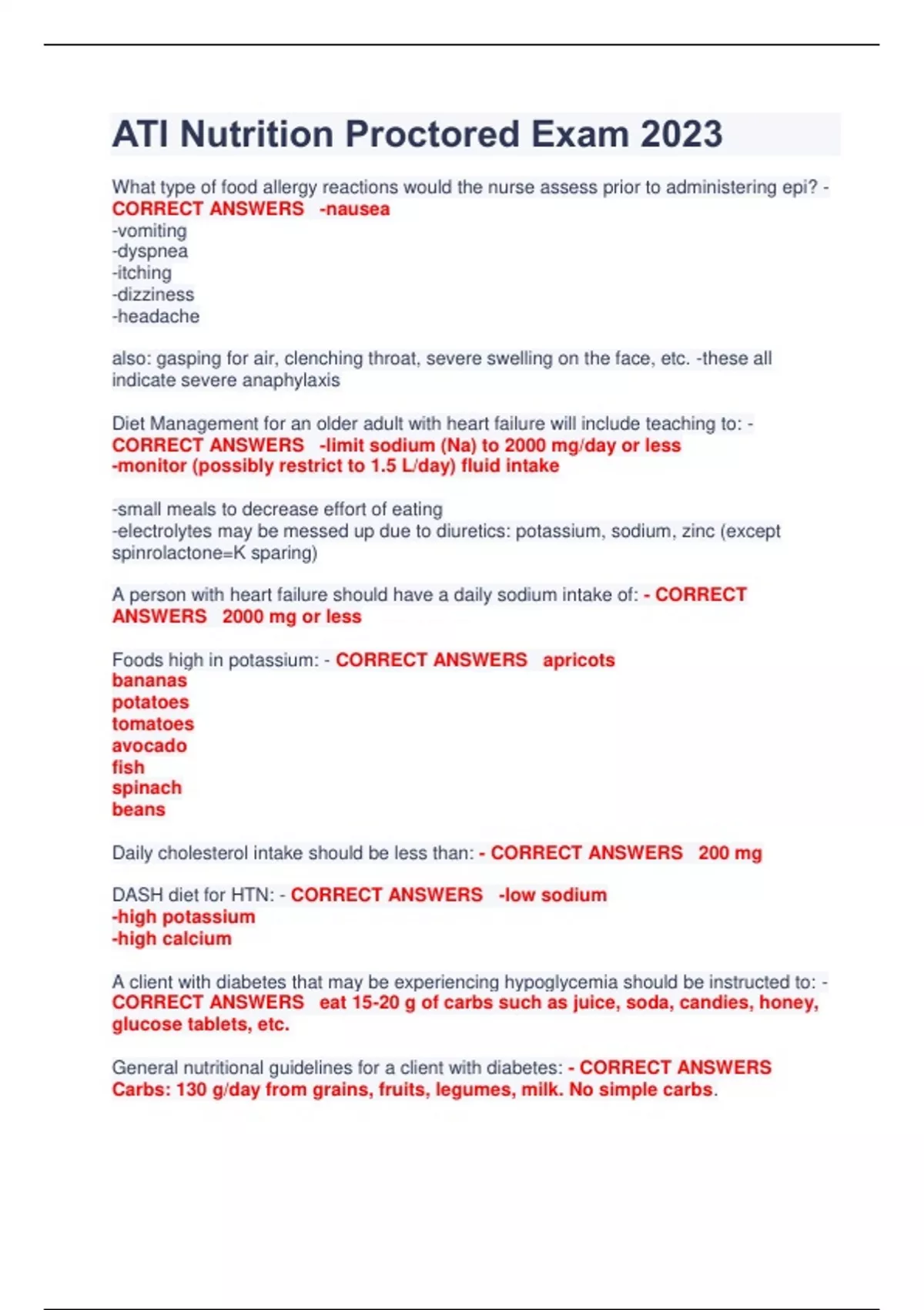 ATI Nutrition Proctored Exam 2023 What type of food allergy reactions would the nurse assess prior to administering epi? - CORRECT ANSWERS -nausea -vomiting -dyspnea -itching -dizziness -headache also: gasping for air, clenching throat, severe swelling on the face, etc. -these all indicate severe anaphylaxis Diet Management for an older adult with heart failure will include teaching to: - CORRECT ANSWERS -limit sodium (Na) to 2000 mg/day or less -monitor (possibly restrict to 1.5 L/day) fluid intake -small meals to decrease effort of eating -electrolytes may be messed up due to diuretics: potassium, sodium, zinc (except spinrolactone=K sparing) A person with heart failure should have a daily sodium intake of: - CORRECT ANSWERS 2000 mg or less Foods high in potassium: - CORRECT ANSWERS apricots bananas potatoes tomatoes avocado fish spinach beans Daily cholesterol intake should be less than: - CORRECT ANSWERS 200 mg DASH diet for HTN: - CORRECT ANSWERS -low sodium -high potassium -high calcium A client with diabetes that may be experiencing hypoglycemia should be instructed to: - CORRECT ANSWERS eat 15-20 g of carbs such as juice, soda, candies, honey, glucose tablets, etc. General nutritional guidelines for a client with diabetes: - CORRECT ANSWERS Carbs: 130 g/day from grains, fruits, legumes, milk. No simple carbs. Fats: sat fat less than 7% of total calories, trans fatty acid less than 1% of total daily caloric intake, limit fried foods. Cholesterol: 200-300 mg/day Fiber: 14 g per 1000 calories from beans, oats, veggies, whole grains Protein: 15-20% total caloric intake from meats, eggs, fish, nuts, beans, & soy products NO TOBACCO, LIMIT ALCOHOL Hyperlipidemia? NO ALCOHOL Artificial sweeteners okay, except preggo! sucrose (table sugar) can be included in diabetic diet as long as adequate insulin is available A nurse is reinforcing diet teaching to a client who has type 2 DM. Which of the following should the nurse include in the teaching? Select all that apply. A. Carbs should comprise 55% of daily caloric intake B. Use hydrogenated oils for cooking C. Table sugar may be added to cereals D. Drink an alcoholic beverage w/meals E. Protein foods can be substituted for carb foods - CORRECT ANSWERS A, C, D Not B-hydrogenated oils contain trans fatty acids & cause hyperlipidemia Not E-carbs can be exchanged but not w/proteins A nurse is reviewing dietary guidelines to include in the plan of care for a client who has type 2 DM. Which of the following guidelines should the nurse include? Select all that apply. A. Weight management B. Lipid profile C. Cultural needs D. Sleep patterns E. Personal preferences - CORRECT ANSWERS A, B, C, E To avoid hypoglycemia, the client should consume alcohol... - CORRECT ANSWERS with a meal or immediately after a meal _______________can be included in a diabetic diet as long as adequate insulin or other agents are provided to cover the sugar intake. - CORRECT ANSWERS Sucrose (table sugar)