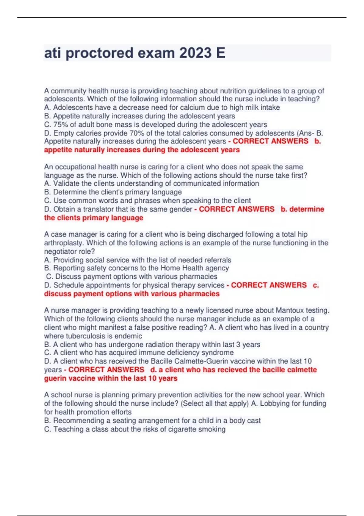 ati proctored exam 2023 E A community health nurse is providing teaching about nutrition guidelines to a group of adolescents. Which of the following information should the nurse include in teaching? A. Adolescents have a decrease need for calcium due to high milk intake B. Appetite naturally increases during the adolescent years C. 75% of adult bone mass is developed during the adolescent years D. Empty calories provide 70% of the total calories consumed by adolescents (Ans- B. Appetite naturally increases during the adolescent years - CORRECT ANSWERS b. appetite naturally increases during the adolescent years An occupational health nurse is caring for a client who does not speak the same language as the nurse. Which of the following actions should the nurse take first? A. Validate the clients understanding of communicated information B. Determine the client's primary language C. Use common words and phrases when speaking to the client D. Obtain a translator that is the same gender - CORRECT ANSWERS b. determine the clients primary language A case manager is caring for a client who is being discharged following a total hip arthroplasty. Which of the following actions is an example of the nurse functioning in the negotiator role? A. Providing social service with the list of needed referrals B. Reporting safety concerns to the Home Health agency C. Discuss payment options with various pharmacies D. Schedule appointments for physical therapy services - CORRECT ANSWERS c. discuss payment options with various pharmacies A nurse manager is providing teaching to a newly licensed nurse about Mantoux testing. Which of the following clients should the nurse manager include as an example of a client who might manifest a false positive reading? A. A client who has lived in a country where tuberculosis is endemic B. A client who has undergone radiation therapy within last 3 years C. A client who has acquired immune deficiency syndrome D. A client who has received the Bacille Calmette-Guerin vaccine within the last 10 years - CORRECT ANSWERS d. a client who has recieved the bacille calmette guerin vaccine within the last 10 years A school nurse is planning primary prevention activities for the new school year. Which of the following should the nurse include? (Select all that apply) A. Lobbying for funding for health promotion efforts B. Recommending a seating arrangement for a child in a body cast C. Teaching a class about the risks of cigarette smoking D. Create a plan of care for children who have a diagnosis of diabetes mellitus E. Organizing a program to promote skateboard safety - CORRECT ANSWERS a. lobbying for funding for health promotion efforts c. teaching a class about the risks for cigarette smoking e. organizing a program to promote skateboard saftey A recently hired occupational health nurse is assessing hazards in the work environment. Which of the following actions will help the nurse detect physical hazards? A. Identify industrial toxins that are present in the environment B. Measure noise levels at various locations in the facility C. Track rates of illness caused by infection among employees D. Survey workers about job-related emotional stress - CORRECT ANSWERS b. measure the noise levels at various locations in the facility A hospice nurse is planning care for a client who follows traditional American Indian practices. Which of the following actions should the nurse take? A. Discuss safe use of herbal medications B. Provide direct eye contact when communicating with the client's family C. Face the client's bed towards the east D. Develop a list of appropriate hot and cold food choices - CORRECT ANSWERS a. discuss safe use of herbal medications A community health nurse is working with a group of homeless veterans who have posttraumatic stress disorder. Which of the following interventions should the nurse implement? A. Provide coffee and snacks during the meetings B. Avoid discussing the traumatic event experienced by the veterans C. Teach the clients to practice deep breathing exercises D. Change the meeting sites frequently - CORRECT ANSWERS c. teach the clients to practice deep breathing excerises A group of technicians from a local automotive repair shop presents to an urgent care clinic with reports of dizziness, headaches, and nausea. After providing need to care for the clients which of the following government agencies should the nurse notify to follow up on these reports? A. OSHA B. Center for Disease Control C. Environmental Protection Agency D. Department of Health and Human Services - CORRECT ANSWERS a. osha A nurse is providing teaching to a 50-year-old female client. Which of the following statement should the nurse include in teaching? A. You should have your fasting blood glucose level checked every 6 years B. You should have your hearing screen every 5 years C. You should have complete eye examination every two years until the age of 64