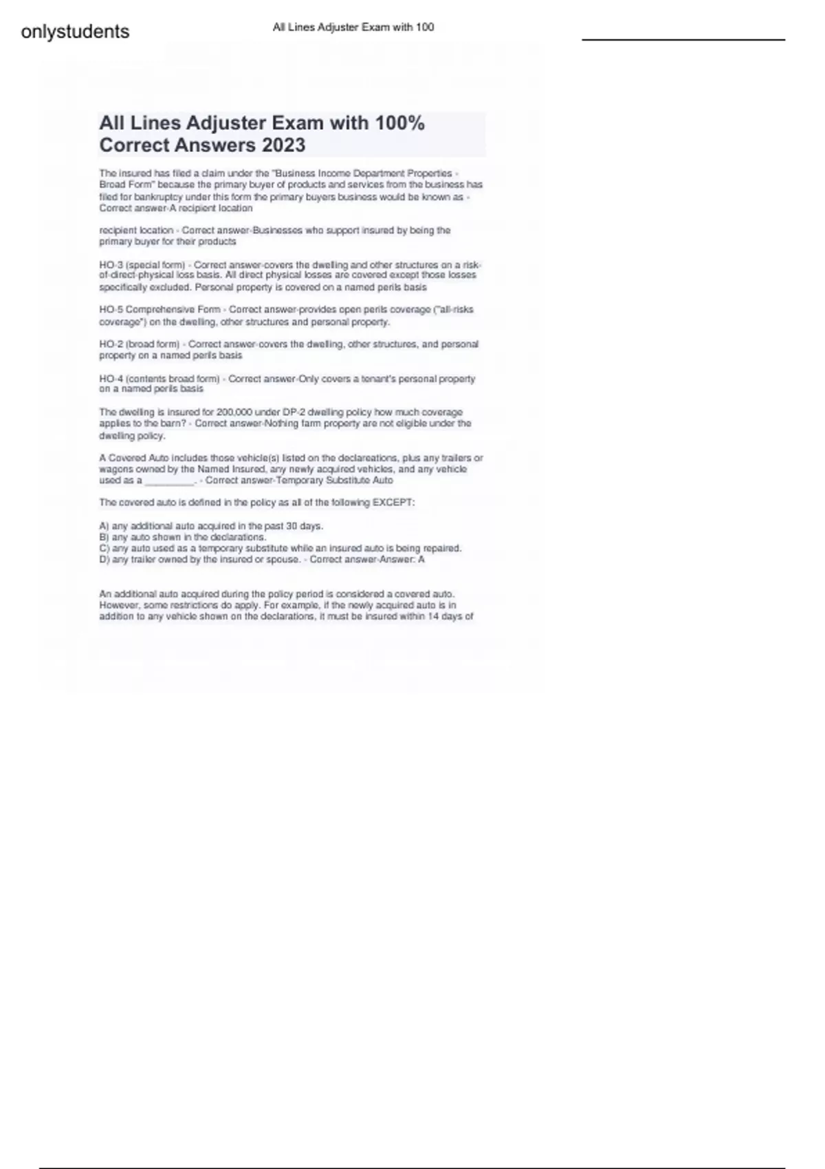 All Lines Adjuster Exam with 100% Correct Answers 2024 The insured has filed a claim under the "Business Income Department Properties - Broad Form" because the primary buyer of products and services from the business has filed for bankruptcy under this form the primary buyers business would be known as - Correct answer-A recipient location recipient location - Correct answer-Businesses who support insured by being the primary buyer for their products HO-3 (special form) - Correct answer-covers the dwelling and other structures on a risk- of-direct-physical loss basis. All direct physical losses are covered except those losses specifically excluded. Personal property is covered on a named perils basis HO-5 Comprehensive Form - Correct answer-provides open perils coverage ("all-risks coverage") on the dwelling, other structures and personal property. HO-2 (broad form) - Correct answer-covers the dwelling, other structures, and personal property on a named perils basis HO-4 (contents broad form) - Correct answer-Only covers a tenant's personal property on a named perils basis The dwelling is insured for 200,000 under DP-2 dwelling policy how much coverage applies to the barn? - Correct answer-Nothing farm property are not eligible under the dwelling policy. A Covered Auto includes those vehicle(s) listed on the declareations, plus any trailers or wagons owned by the Named Insured, any newly acquired vehicles, and any vehicle used as a _________. - Correct answer-Temporary Substitute Auto The covered auto is defined in the policy as all of the following EXCEPT: A) any additional auto acquired in the past 30 days. B) any auto shown in the declarations. C) any auto used as a temporary substitute while an insured auto is being repaired. D) any trailer owned by the insured or spouse. - Correct answer-Answer: A An additional auto acquired during the policy period is considered a covered auto. However, some restrictions do apply. For example, if the newly acquired auto is in addition to any vehicle shown on the declarations, it must be insured within 14 days of onlystudents 11/4/23, 6:20 PM All Lines Adjuster Exam with 100 about:blank 2/17 the purchase date. If it replaces one of the cars, the insured does not need to add it during that policy period. Coverage F on homeowners policy provides - Correct answer-Medical payments to others; pays all necessary medical expenses for up to three years after an accident. Coverage F: Medical Payments to Others - Correct answer-Does not apply to the insured or members of the insured's household Not liability coverage and is not base on fault An insured has taken inventory of his merchandise and discovers a substantial shortage of valuable stock. He submits a claim to his insurance carrier that provides his coverage under a Business Owners Policy. What coverage is provided by the BOP? - Correct answer-No coverage would apply, there is no coverage for missing property when there is no physical evidence to show cause of loss Arbitration (ADR) - Correct answer-Neutral third party hears a dispute and makes a decision both parties have agreed to follow. Mediation - Correct answer-A method of settling disputes outside of court by using the services of a neutral third party, called a mediator. The mediator acts as a communicating agent between the parties and suggests ways in which the parties can resolve their dispute. Not binding. Difference between Arbitration and Meditation? - Correct answer-Mediation is not binding, Arbitration is. Mediation-Arbitration - Correct answer-If the parties cannot reach a settlement through mediation, an arbitrator will resolve the dispute. The building and personal property coverage form provides coverage for outdoor signs - Correct answer-Whether attached to the building or not for up to 2,500 if damaged by a peril insured against. Building and Personal Property Coverage Form - Correct answer-Commercial Property coverage form that covers buildings, the insured's business personal property, and the personal property of others located at the business premises Foreseeability Test - Correct answer-To determine if the defendant's conduct was the proximate cause of the plaintiff's injury, the court applies Foreseeability - Correct answer-excludes liability for harms that were sufficiently unforeseeable at the time of the defendant's tortious conduct. Purpose of freight insurance - Correct answer-Covers shipper fees