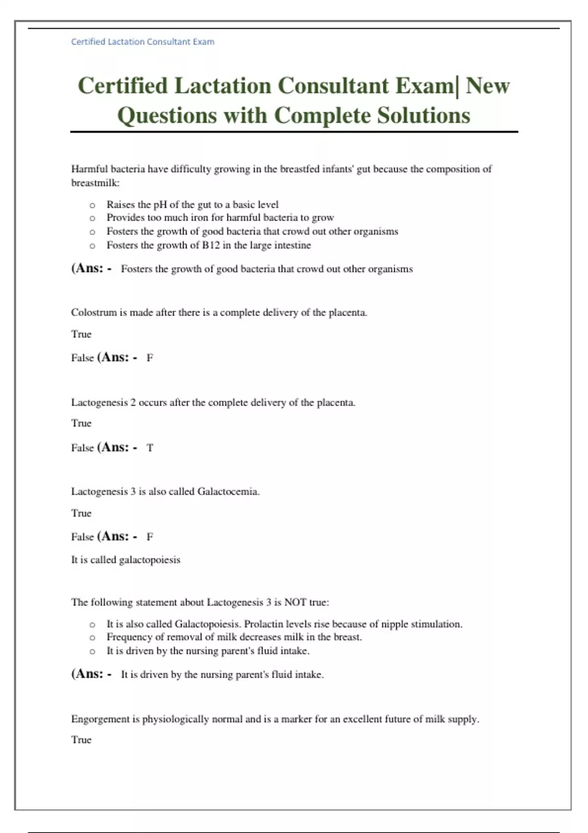 Certified Lactation Consultant Exam| New Questions with Complete Solutions| Test Bank Harmful bacteria have difficulty growing in the breastfed infants' gut because the composition of breastmilk: o Raises the pH of the gut to a basic level o Provides too much iron for harmful bacteria to grow o Fosters the growth of good bacteria that crowd out other organisms o Fosters the growth of B12 in the large intestine (Ans: - Fosters the growth of good bacteria that crowd out other organisms Colostrum is made after there is a complete delivery of the placenta. True False (Ans: - F Lactogenesis 2 occurs after the complete delivery of the placenta. True False (Ans: - T