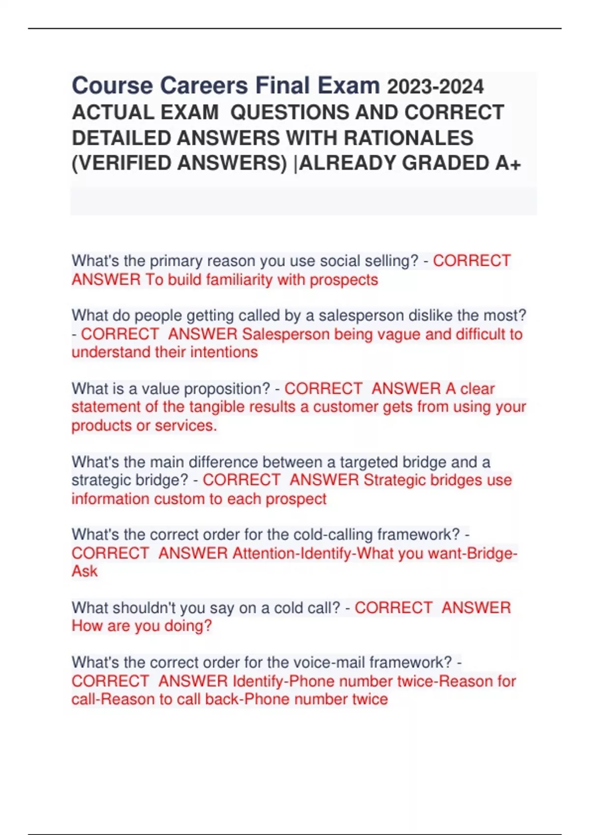 Course Careers Final Exam ACTUAL EXAM QUESTIONS AND CORRECT DETAILED ANSWERS WITH RATIONALES (VERIFIED ANSWERS) |ALREADY GRADED A+ What's the primary reason you use social selling? - CORRECT ANSWER To build familiarity with prospects What do people getting called by a salesperson dislike the most? - CORRECT ANSWER Salesperson being vague and difficult to understand their intentions What is a value proposition? - CORRECT ANSWER A clear statement of the tangible results a customer gets from using your products or services. What's the main difference between a targeted bridge and a strategic bridge? - CORRECT ANSWER Strategic bridges use information custom to each prospect What's the correct order for the cold-calling framework? - CORRECT ANSWER Attention-Identify-What you want-BridgeAsk What shouldn't you say on a cold call? - CORRECT ANSWER How are you doing? What's the correct order for the voice-mail framework? - CORRECT ANSWER Identify-Phone number twice-Reason for call-Reason to call back-Phone number twic