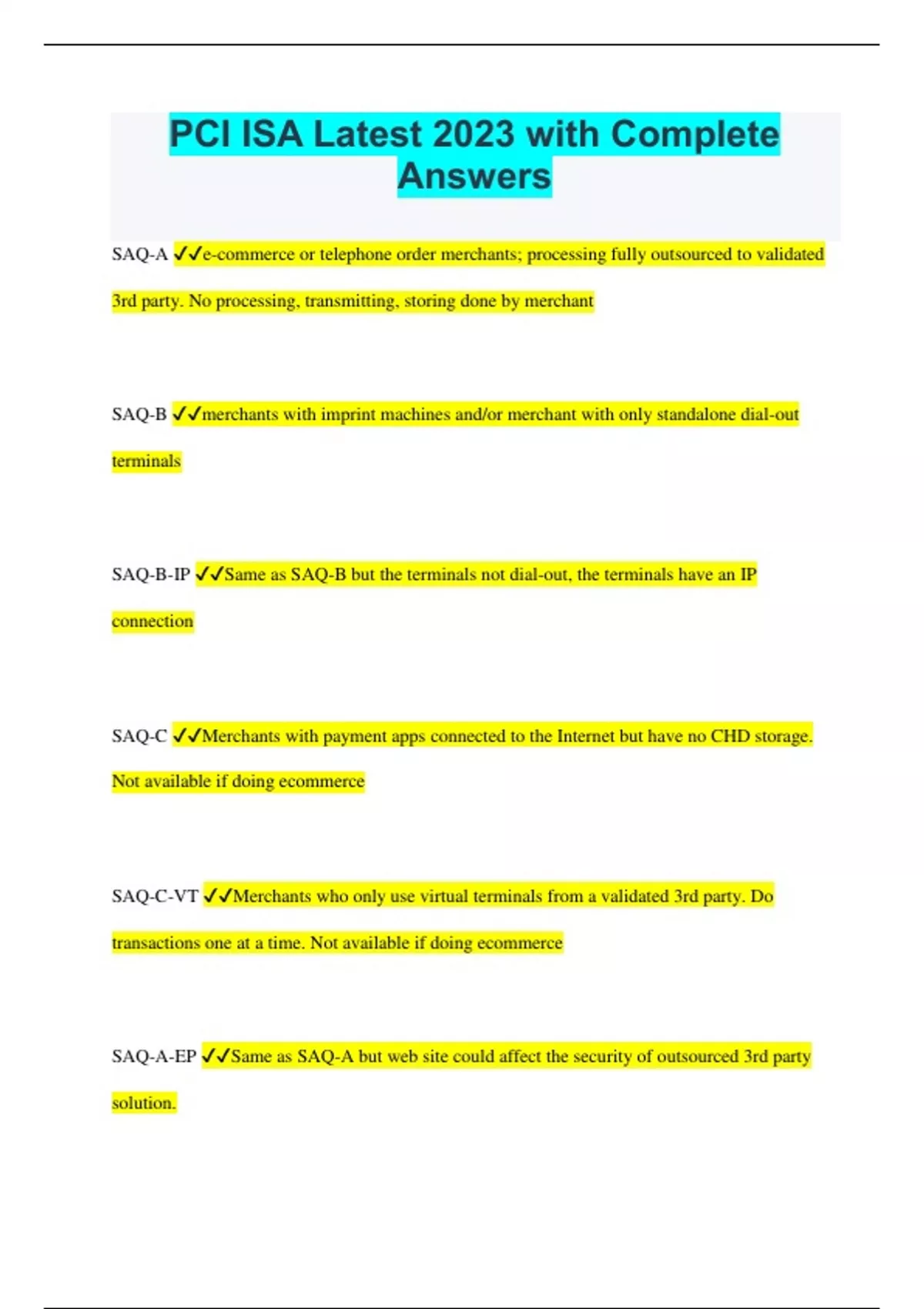 SAQ-A e-commerce or telephone order merchants; processing fully outsourced to validated 3rd party. No processing, transmitting, storing done by merchant SAQ-B merchants with imprint machines and/or merchant with only standalone dial-out terminals SAQ-B-IP Same as SAQ-B but the terminals not dial-out, the terminals have an IP connection SAQ-C Merchants with payment apps connected to the Internet but have no CHD storage. Not available if doing ecommerce SAQ-C-VT Merchants who only use virtual terminals from a validated 3rd party. Do transactions one at a time. Not available if doing ecommerce SAQ-A-EP Same as SAQ-A but web site could affect the security of outsourced 3rd party solution.