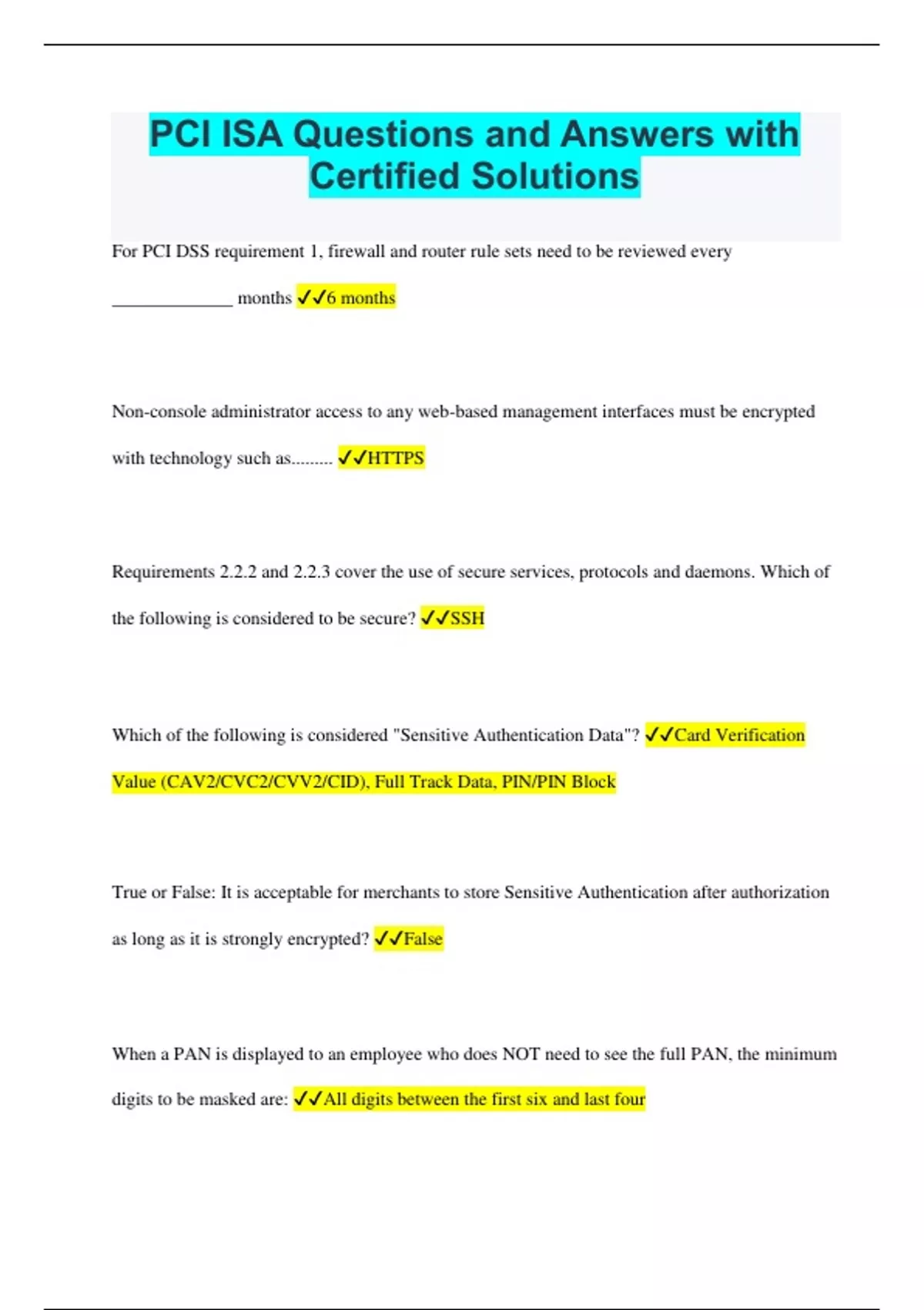 For PCI DSS requirement 1, firewall and router rule sets need to be reviewed every _____________ months 6 months Non-console administrator access to any web-based management interfaces must be encrypted with technology such as......... HTTPS Requirements 2.2.2 and 2.2.3 cover the use of secure services, protocols and daemons. Which of the following is considered to be secure? SSH Which of the following is considered "Sensitive Authentication Data"? Card Verification Value (CAV2/CVC2/CVV2/CID), Full Track Data, PIN/PIN Block True or False: It is acceptable for merchants to store Sensitive Authentication after authorization as long as it is strongly encrypted? False When a PAN is displayed to an employee who does NOT need to see the full PAN, the minimum digits to be masked are: All digits between the first six and last fou
