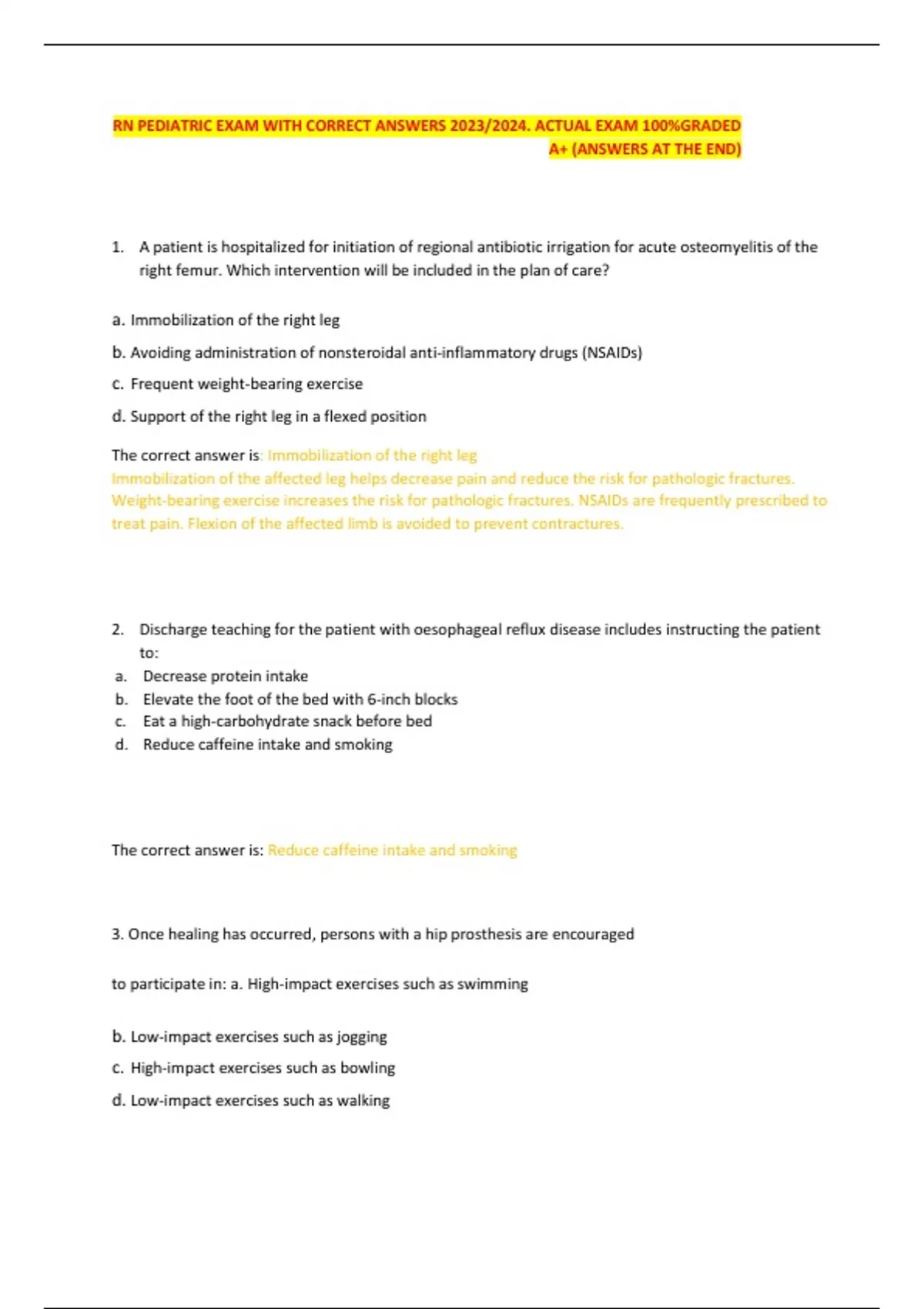 RN PEDIATRIC EXAM WITH CORRECT ANSWERS 2023/2024. ACTUAL EXAM 100%GRADED A+ (ANSWERS AT THE END) 1. A patient is hospitalized for initiation of regional antibiotic irrigation for acute osteomyelitis of the right femur. Which intervention will be included in the plan of care? a. Immobilization of the right leg b. Avoiding administration of nonsteroidal anti-inflammatory drugs (NSAIDs) c. Frequent weight-bearing exercise d. Support of the right leg in a flexed position The correct answer is: Immobilization of the right leg Immobilization of the affected leg helps decrease pain and reduce the risk for pathologic fractures. Weight-bearing exercise increases the risk for pathologic fractures. NSAIDs are frequently prescribed to treat pain. Flexion of the affected limb is avoided to prevent contractures. 2. Discharge teaching for the patient with oesophageal reflux disease includes instructing the patient to: a. Decrease protein intake b. Elevate the foot of the bed with 6-inch blocks c. Eat a high-carbohydrate snack before bed d. Reduce caffeine intake and smoking The correct answer is: Reduce caffeine intake and smoking 3. Once healing has occurred, persons with a hip prosthesis are encouraged to participate in: a. High-impact exercises such as swimming b. Low-impact exercises such as jogging c. High-impact exercises such as bowling d. Low-impact exercises such as walking The correct answer is: Low-impact exercises such as walking