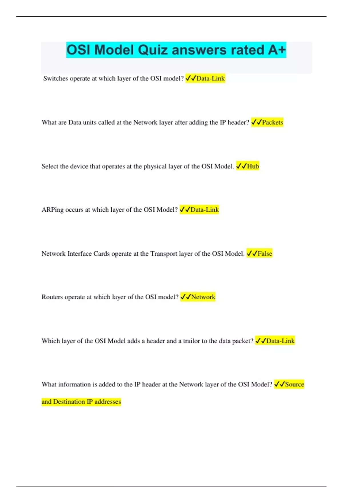 Switches operate at which layer of the OSI model? Data-Link What are Data units called at the Network layer after adding the IP header? Packets Select the device that operates at the physical layer of the OSI Model. Hub ARPing occurs at which layer of the OSI Model? Data-Link Network Interface Cards operate at the Transport layer of the OSI Model. False Routers operate at which layer of the OSI model? Network Which layer of the OSI Model adds a header and a trailor to the data packet? Data-Link What information is added to the IP header at the Network layer of the OSI Model? Source and Destination IP addresses