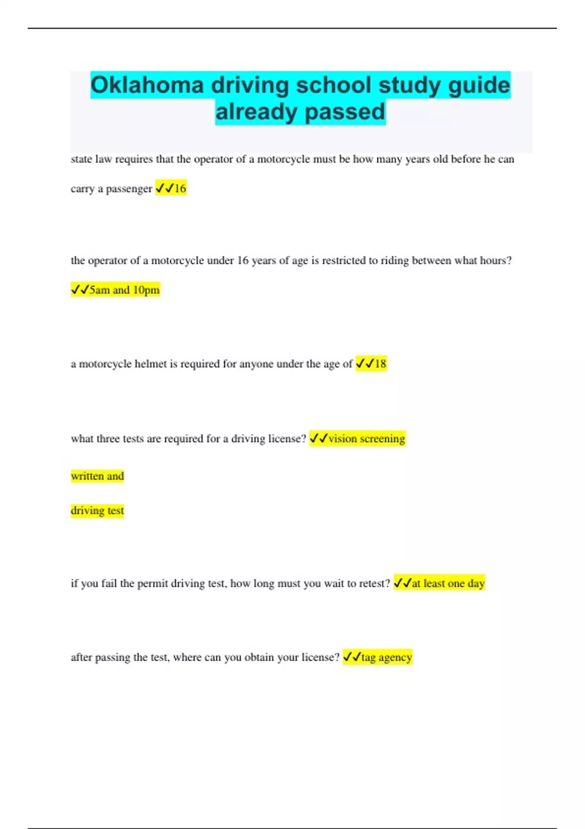 state law requires that the operator of a motorcycle must be how many years old before he can carry a passenger 16 the operator of a motorcycle under 16 years of age is restricted to riding between what hours? 5am and 10pm a motorcycle helmet is required for anyone under the age of 18 what three tests are required for a driving license? vision screening written and driving test if you fail the permit driving test, how long must you wait to retest? at least one day after passing the test, where can you obtain your license? tag agenc