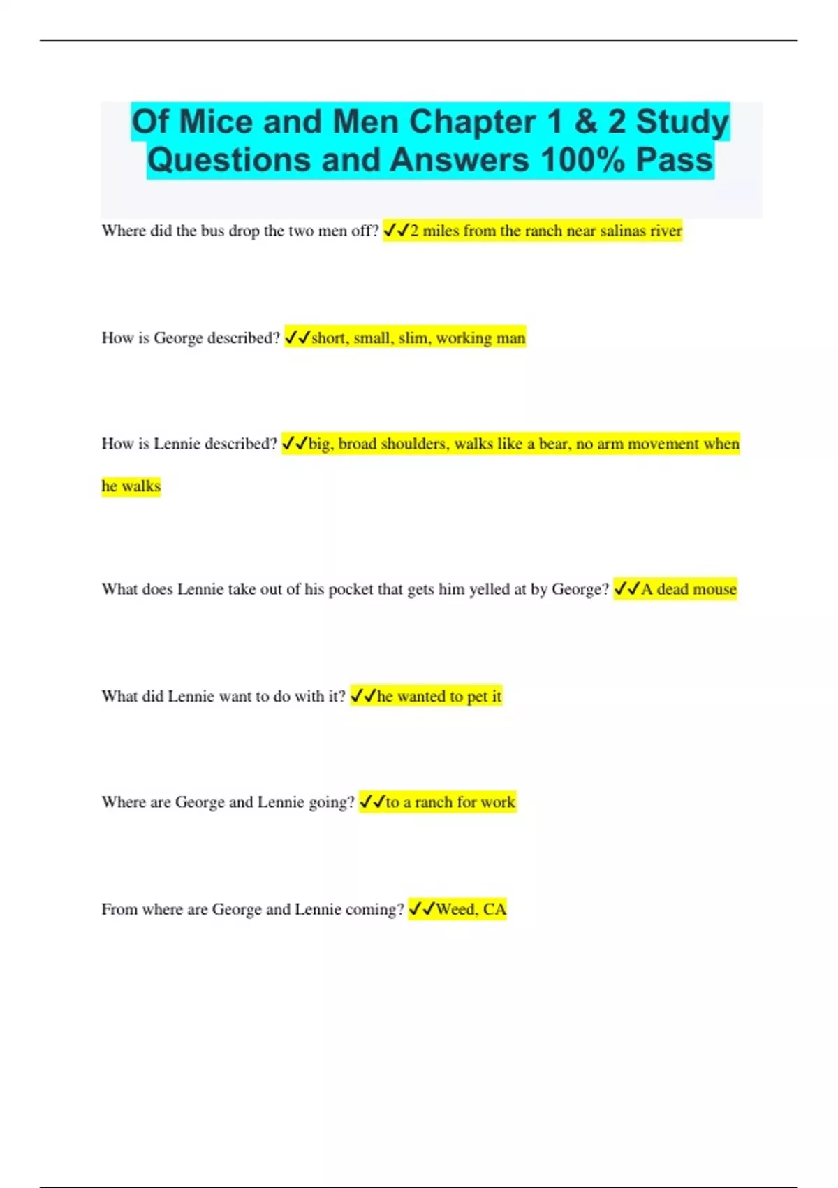 Of Mice and Men Chapter 1 & 2 Study Questions and Answers 100% Pass