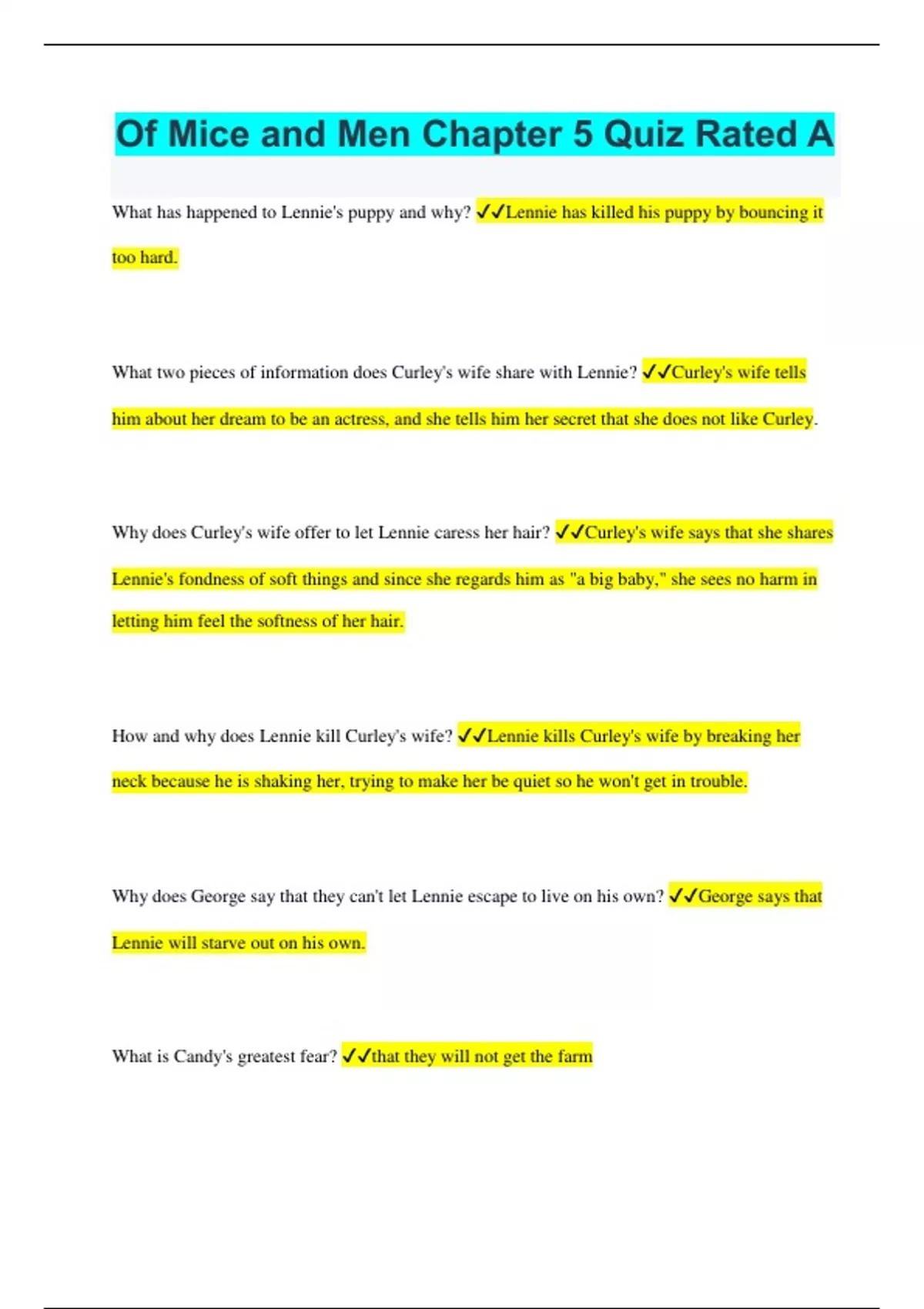 What has happened to Lennie's puppy and why? Lennie has killed his puppy by bouncing it too hard. What two pieces of information does Curley's wife share with Lennie? Curley's wife tells him about her dream to be an actress, and she tells him her secret that she does not like Curley. Why does Curley's wife offer to let Lennie caress her hair? Curley's wife says that she shares Lennie's fondness of soft things and since she regards him as "a big baby," she sees no harm in letting him feel the softness of her hair. How and why does Lennie kill Curley's wife? Lennie kills Curley's wife by breaking her neck because he is shaking her, trying to make her be quiet so he won't get in trouble. Why does George say that they can't let Lennie escape to live on his own? George says that Lennie will starve out on his own.