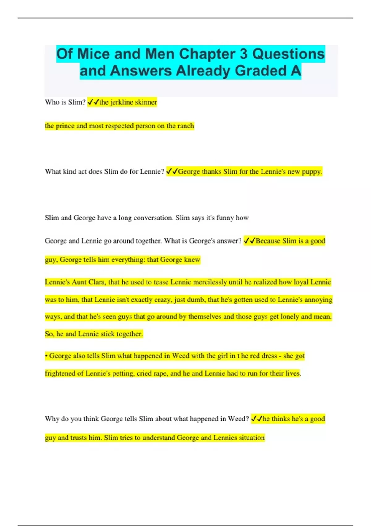 Of Mice and Men Chapter 3 Questions and Answers Already Graded A