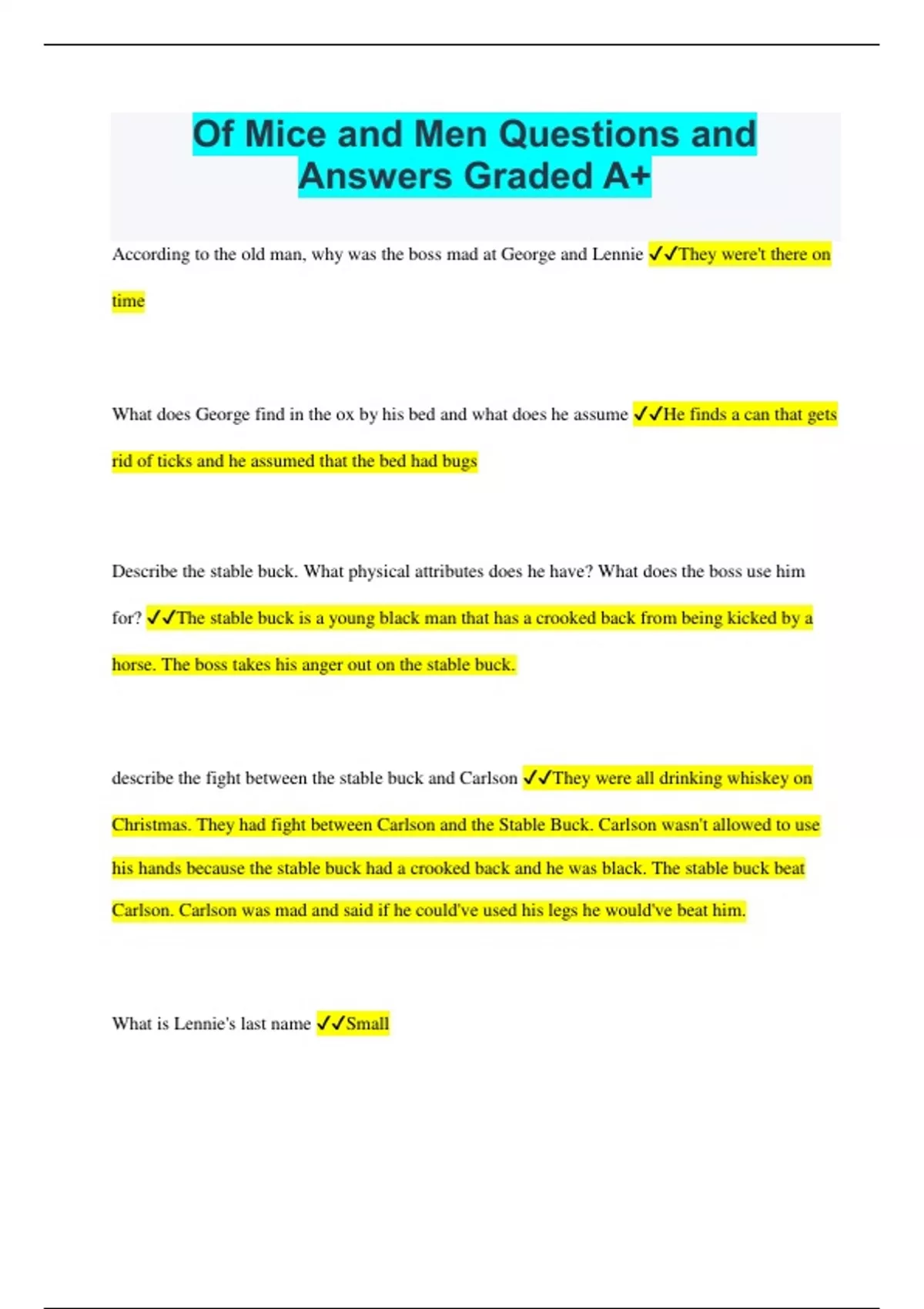 According to the old man, why was the boss mad at George and Lennie They were't there on time What does George find in the ox by his bed and what does he assume He finds a can that gets rid of ticks and he assumed that the bed had bugs Describe the stable buck. What physical attributes does he have? What does the boss use him for? The stable buck is a young black man that has a crooked back from being kicked by a horse. The boss takes his anger out on the stable buck. describe the fight between the stable buck and Carlson They were all drinking whiskey on Christmas. They had fight between Carlson and the Stable Buck. Carlson wasn't allowed to use his hands because the stable buck had a crooked back and he was black. The stable buck beat Carlson. Carlson was mad and said if he could've used his legs he would've beat him. What is Lennie's last name Small