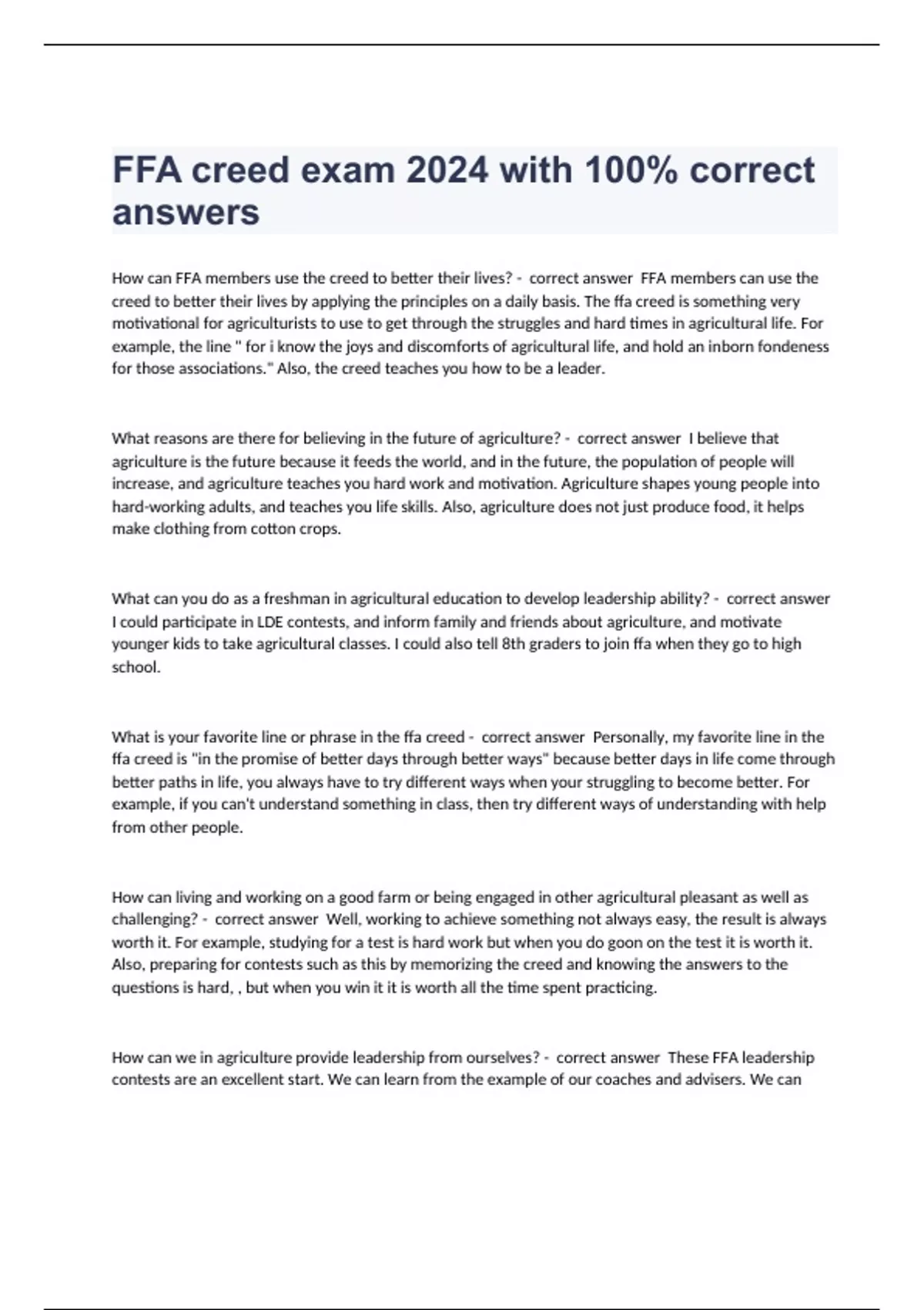 How can FFA members use the creed to better their lives? - correct answer FFA members can use the creed to better their lives by applying the principles on a daily basis. The ffa creed is something very motivational for agriculturists to use to get through the struggles and hard times in agricultural life. For example, the line " for i know the joys and discomforts of agricultural life, and hold an inborn fondeness for those associations." Also, the creed teaches you how to be a leader. What reasons are there for believing in the future of agriculture? - correct answer I believe that agriculture is the future because it feeds the world, and in the future, the population of people will increase, and agriculture teaches you hard work and motivation. Agriculture shapes young people into hard-working adults, and teaches you life skills. Also, agriculture does not just produce food, it helps make clothing from cotton crops. What can you do as a freshman in agricultural education to develop leadership ability? - correct answer I could participate in LDE contests, and inform family and friends about agriculture, and motivate younger kids to take agricultural classes. I could also tell 8th graders to join ffa when they go to high school. What is your favorite line or phrase in the ffa creed - correct answer Personally, my favorite line in the ffa creed is "in the promise of better days through better ways" because better days in life come through better paths in life, you always have to try different ways when your struggling to become better. For example, if you can't understand something in class, then try different ways of understanding with help from other people. How can living and working on a good farm or being engaged in other agricultural pleasant as well as challenging? - correct answer Well, working to achieve something not always easy, the result is always worth it. For example, studying for a test is hard work but when you do goon on the test it is worth it. Also, preparing for contests such as this by memorizing the creed and knowing the answers to the questions is hard, , but when you win it it is worth all the time spent practicing. How can we in agriculture provide leadership from ourselves? - correct answer These FFA leadership contests are an excellent start. We can learn from the example of our coaches and advisers. We can then take those skills and apply them as we move forward in agriculture. always work hard and motivate other people to do their best. How will Ame
