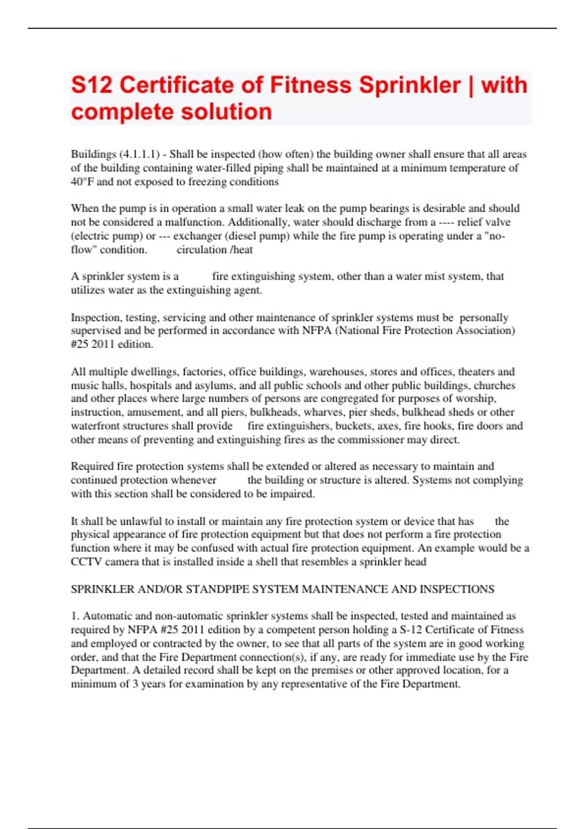 S12 Certificate of Fitness Sprinkler | with complete solution