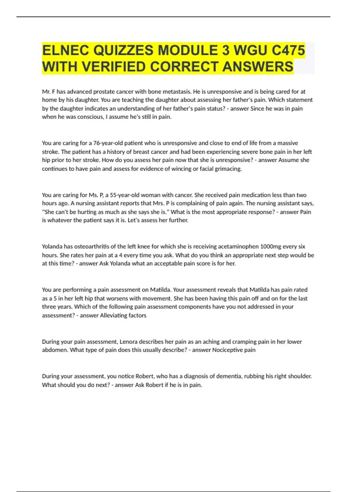 ELNEC QUIZZES MODULE 3 WGU C475 WITH VERIFIED CORRECT ANSWERS Mr. F has advanced prostate cancer with bone metastasis. He is unresponsive and is being cared for at home by his daughter. You are teaching the daughter about assessing her father's pain. Which statement by the daughter indicates an understanding of her father's pain status? - answer Since he was in pain when he was conscious, I assume he's still in pain. You are caring for a 76-year-old patient who is unresponsive and close to end of life from a massive stroke. The patient has a history of breast cancer and had been experiencing severe bone pain in her left hip prior to her stroke. How do you assess her pain now that she is unresponsive? - answer Assume she continues to have pain and assess for evidence of wincing or facial grimacing. You are caring for Ms. P, a 55-year-old woman with cancer. She received pain medication less than two hours ago. A nursing assistant reports that Mrs. P is complaining of pain again. The nursing assistant says, "She can't be hurting as much as she says she is." What is the most appropriate response? - answer Pain is whatever the patient says it is. Let's assess her further. Yolanda has osteoarthritis of the left knee for which she is receiving acetaminophen 1000mg every six hours. She rates her pain at a 4 every time you ask. What do you think an appropriate next step would be at this time? - answer Ask Yolanda what an acceptable pain score is for her. You are performing a pain assessment on Matilda. Your assessment reveals that Matilda has pain rated as a 5 in her left hip that worsens with movement. She has been having this pain off and on for the last three years. Which of the following pain assessment components have you not addressed in your assessment? - answer Alleviating factors During your pain assessment, Lenora describes her pain as an aching and cramping pain in her lower