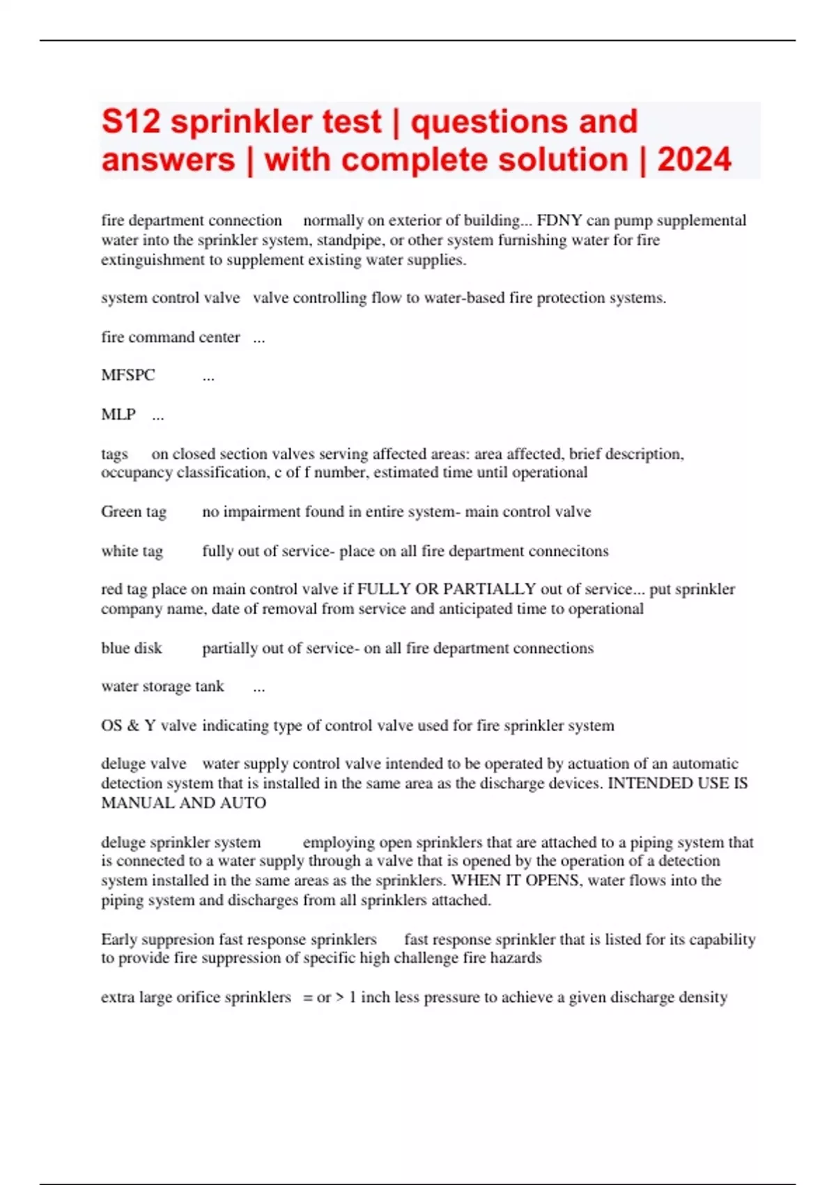 S12 sprinkler test | questions and answers | with complete solution | 2024