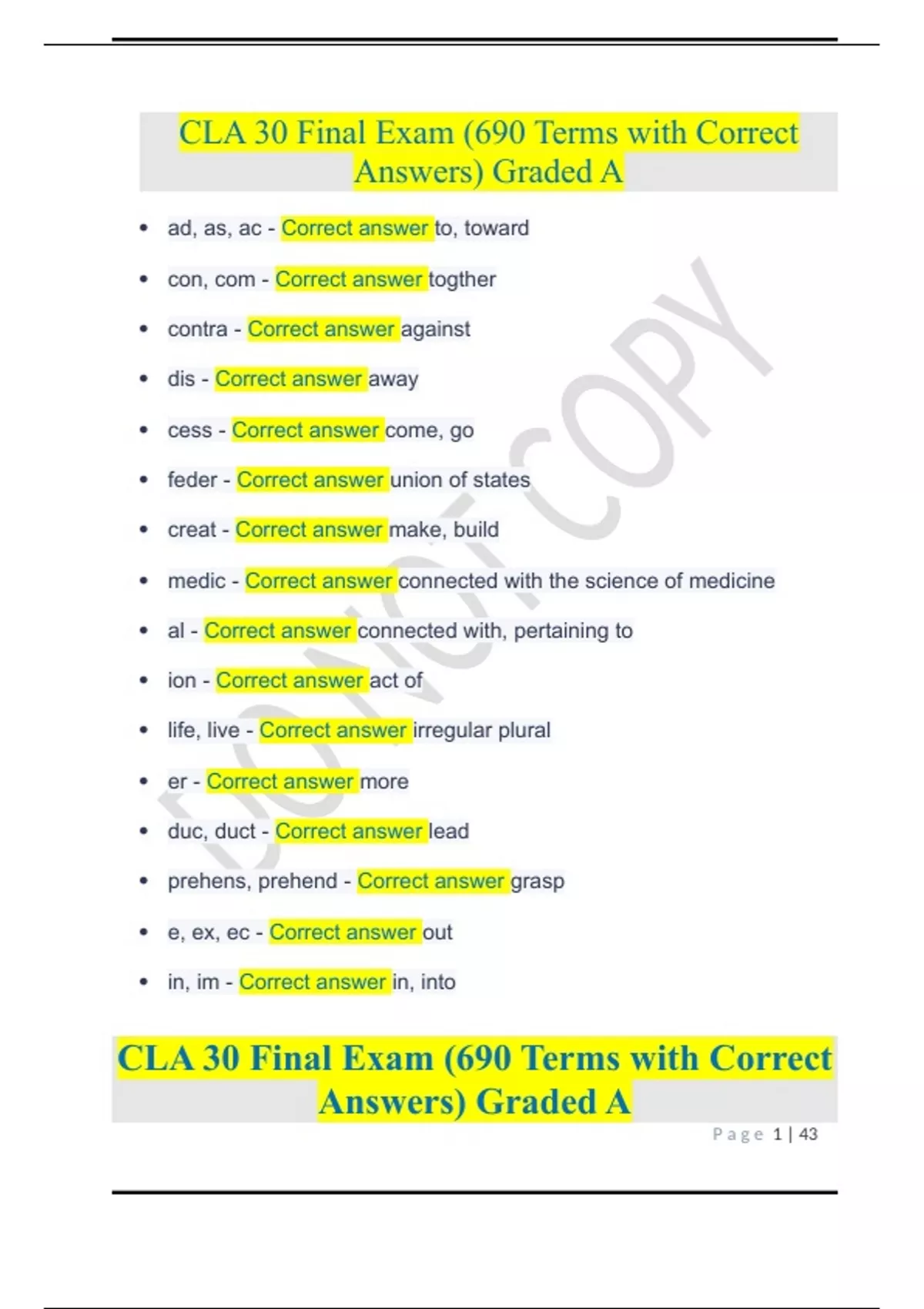 CLA 30 Final Exam (690 Terms with Correct Answers) Graded A.