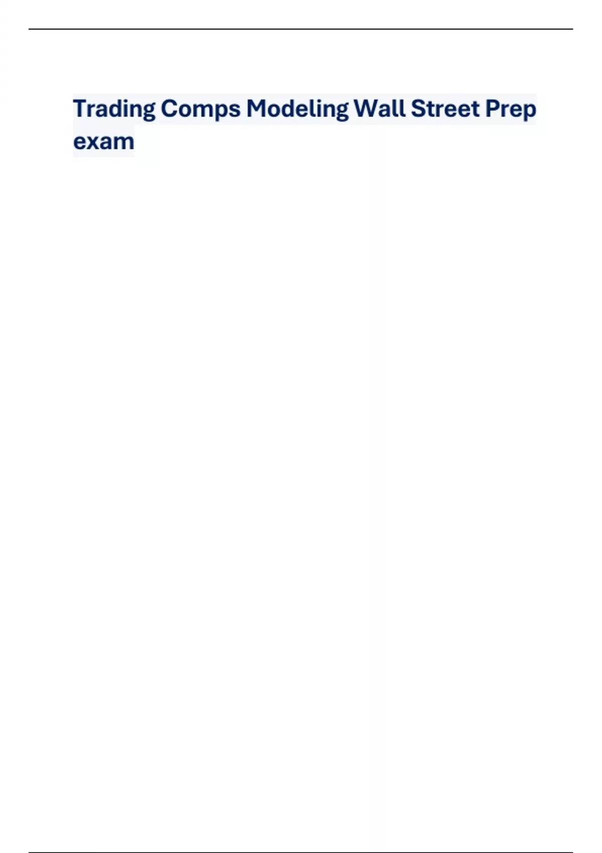 Trading Comps Modeling Wall Street Prep exam Assets - CORRECT ANSWER-resources a company uses to operate its business includes cash, A/R, PP&E Liabilities - CORRECT ANSWER-represents the company's contractual obligations and includes A/P, debt, accrued expenses Shareholder's equity - CORRECT ANSWER-is the residual the value of the business available to the owners (shareholders) after debts have been paid off Income statement - CORRECT ANSWER-illustrates the profitability of the company over a specified period of time broad sense: shows revenue-expenses Balance sheet - CORRECT ANSWER-snapshot of the company economic resources and funding for those resources at a given point in time (A = L + SE) Revenue - CORRECT ANSWER-"top-line" represents the sale of goods and services it is recorded when earned (even though cash might not have been received at the time of transaction) Expenses - CORRECT ANSWER-netted against revenue to arrive at net income COGS (directly associate with good production), SG&A (indirectly associated with production), interest expense (expense related to paying debt holders periodic payments), taxes, depreciation expense (non-cash expense accounting for the use of PP&E, often imbedded within COGS and SG&A) Net income - CORRECT ANSWER-"bottom-line" revenue-expenses the profitability available to common shareholder's after debt payments have been made (interest expense) EPS (earnings per share) - CORRECT ANSWER-portion of a company's profit allocated to each outstanding share of common stock EPS = (net income - dividends on preferred stock)/weighted average shares outstanding Cash flow statement - CORRECT ANSWER-While cash is not necessarily received when a sale occurs, the income statement still records the sale. As a result, the income statement captures all the economic transactions of the business. The cash flow statement is needed because the income statement uses what is called accrual accounting. In accrual accounting, revenues are recorded when earned regardless of when cash is received (revenue includes sales using cash and made on credit A/R) Since we also want to have a clear understanding of the cash position of a company, we need the statement of cash flows to reconcile the income statement to cash inflows and outflows.