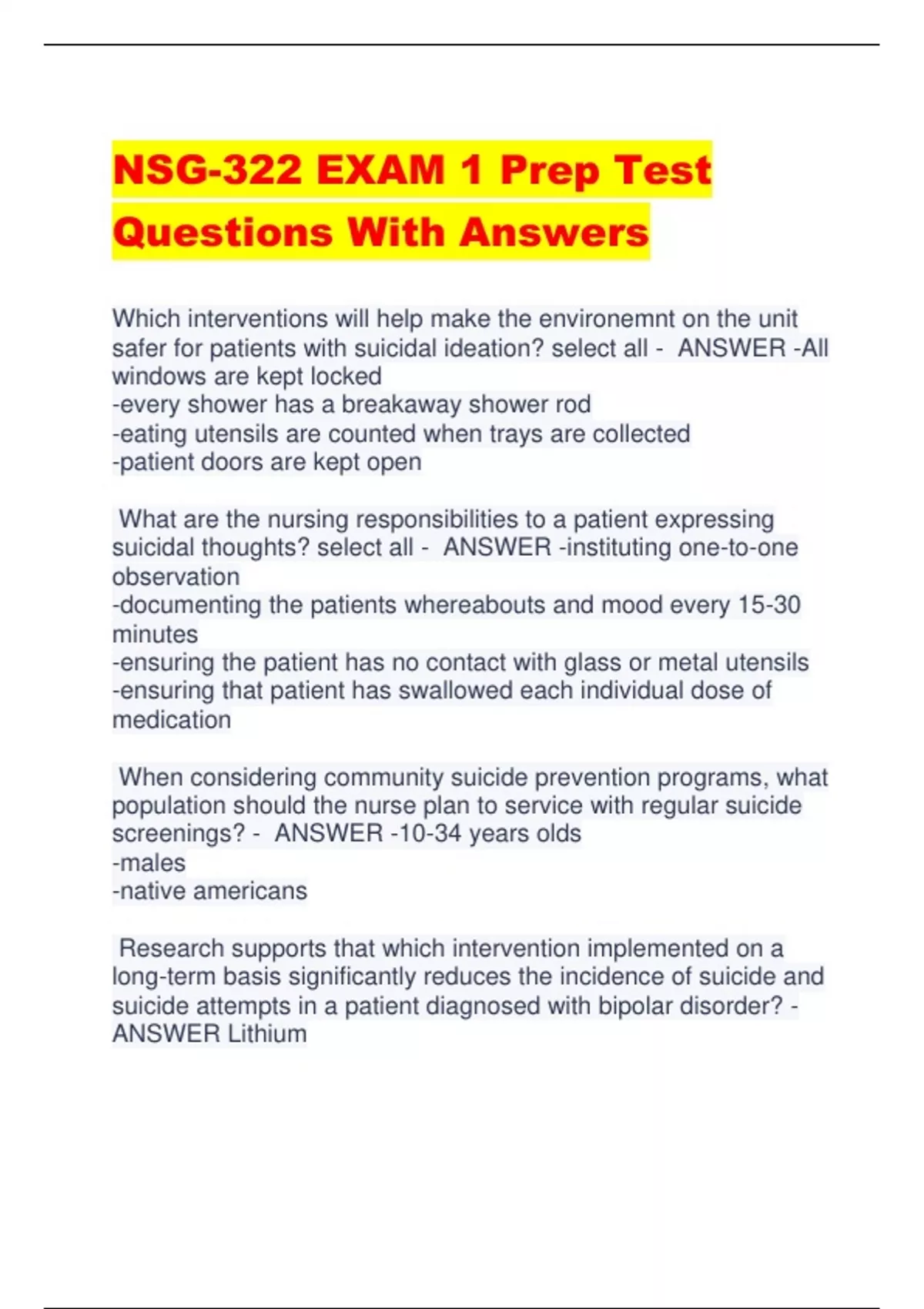 NSG-322 EXAM 1 Prep Test Questions With Answers Which interventions will help make the environemnt on the unit safer for patients with suicidal ideation? select all - ANSWER -All windows are kept locked -every shower has a breakaway shower rod -eating utensils are counted when trays are collected -patient doors are kept open What are the nursing responsibilities to a patient expressing suicidal thoughts? select all - ANSWER -instituting one-to-one observation -documenting the patients whereabouts and mood every 15-30 minutes -ensuring the patient has no contact with glass or metal utensils -ensuring that patient has swallowed each individual dose of medication When considering community suicide prevention programs, what population should the nurse plan to service with regular suicide screenings? - ANSWER -10-34 years olds -males -native americans Research supports that which intervention implemented on a long-term basis significantly reduces the incidence of suicide and suicide attempts in a patient diagnosed with bipolar disorder? - ANSWER Lithium Gladys is seeing a therapist because her husband committed suicide 6 months ago. Gladys tells her therapist, "I know he was in pain, but why didn't he leave me a note?" The therapist's best response would be: a. "He probably acted quickly on his impulse to kill himself." b. "He did not want to think about the pain he would cause you." c. "He was not able to think clearly due to his emotional pain." d. "He thought you may think it was an accident if there was no note." - ANSWER He was not able to think clearly due to his emotional pain Martin is a 23-year-old male with a new diagnosis of schizophrenia, and his family is receiving information from a home health nurse. The topic of education is suicide prevention, and the nurse recognizes effective teaching when the mother says: a. "Persons with schizophrenia rarely commit suicide." b. "Suicide risk is greatest in the first few years after diagnosis." c. "Suicide is not common in schizophrenia due to confusion." d. "Most persons diagnosed with schizophrenia die of suicide." - ANSWER suicide risk is greatest in the first few years after diagnosis Sigmund Freud, Karl Menninger, and Aaron Beck theorized tha