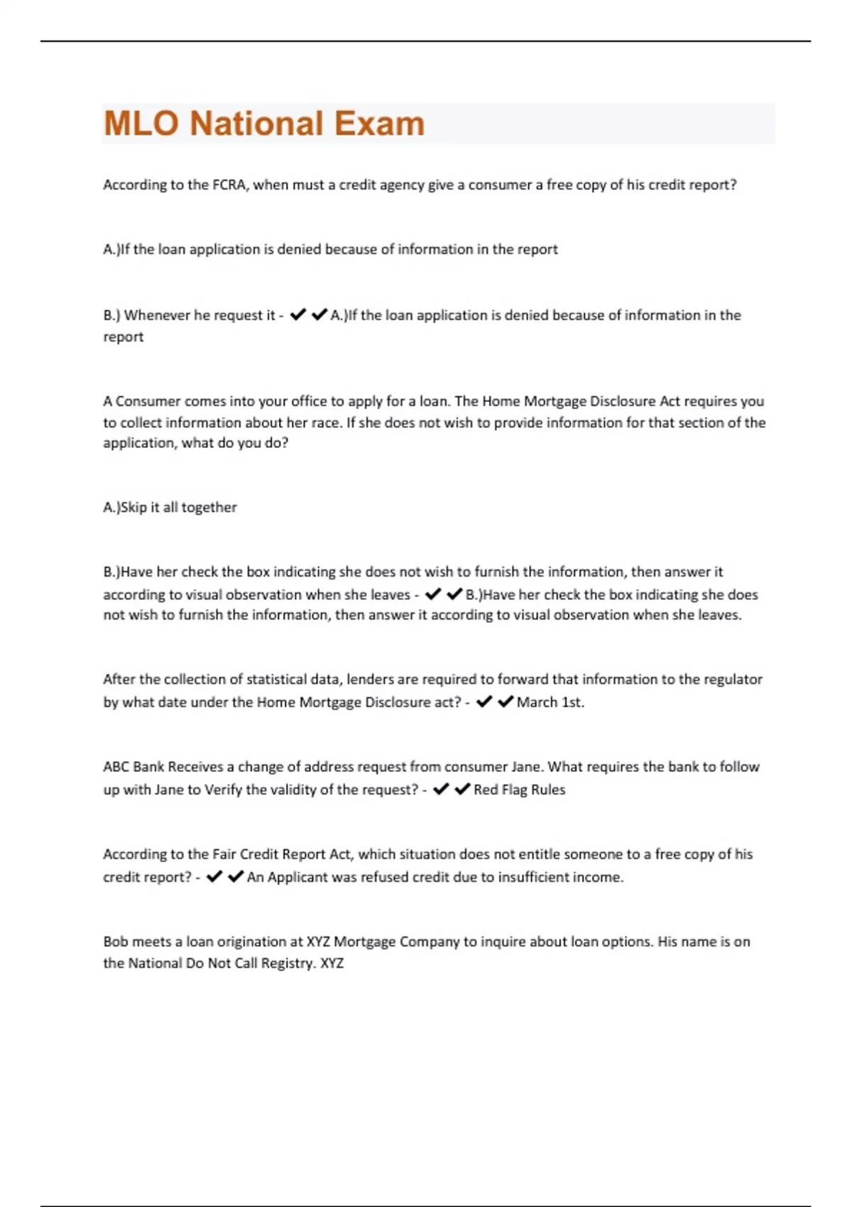According to the FCRA, when must a credit agency give a consumer a free copy of his credit report? A.)If the loan application is denied because of information in the report B.) Whenever he request it - A.)If the loan application is denied because of information in the report A Consumer comes into your office to apply for a loan. The Home Mortgage Disclosure Act requires you to collect information about her race. If she does not wish to provide information for that section of the application, what do you do? A.)Skip it all together B.)Have her check the box indicating she does not wish to furnish the information, then answer it according to visual observation when she leaves - B.)Have her check the box indicating she does not wish to furnish the information, then answer it according to visual observation when she leaves. After the collection of statistical data, lenders are required to forward that information to the regulator by what date under the Home Mortgage Disclosure act? - March 1st. ABC Bank Receives a change of address request from consumer Jane. What requires the bank to follow up with Jane to Verify the validity of the request? - Red Flag Rules According to the Fair Credit Report Act, which situation does not entitle someone to a free copy of his credit report? - An Applicant was refused credit due to insufficient income. Bob meets a loan origination at XYZ Mortgage Company to inquire about loan options. His name is on the National Do Not Call Registry. XYZa.) Can call Bob for up to 3 months from the meeting date b.) can call Bob for up to 18 months from the meeting date. - a. can Call Bob for up to 3 months from the meeting date. Broker Danny is currently working on four loan applications. For which transactions must Danny follow the regulations of the Truth in Lending Act? a.) Helen's application to purchase a duplex where she will live in one unit and rent the other b.) Bauer and Associates application to purchase a condominium for the use of the partnerships contractors. - Helen's application to purchase a duplex where she will live in one unit and rent the other. FHA mortgage insurance premiums must be paid for a minimum of 11 years for loans with starting LTV of 90% or less True or False - True When a seller owns a property that is to be resold during the first 90 days, a second appraisal is required for a conventional loan if the increase in price would be A. 5% B. 12.5 % - B. 12.5% Regulation Z implements a.) TILA b.) RESPA - A. TILA (Truth in Lending act)Which property transaction is governed by RESPA? a.)Property Improvement loans b.) Buyer assumes an existing first-lien loan - a.) Property improvement loans A loan generally cannot be considered a qualified mortgage (QM) if the points and fees paid by the consumer exceed_____ percent(%) of the total loan amount a.)2 b.)3 - b.)3 Which of these actions would indicate that a loan office is not committed to FACT act compliance? a.Erasing electronic copies b. putting files in an unlocked drawer at the end of each work day - b. Putting files in an unlocked drawer at the end of each work day. One purpose of the Truth in lending act is to - enable borrowers to compare credit cost and shop for the best credit terms A qualified mortgage was first defined by which federal act? - Dodd-Frank Wall Street Reform and Consumer protection Act The Red Flags Rule is part of the - Fair and Accurate Credit Transaction Act
