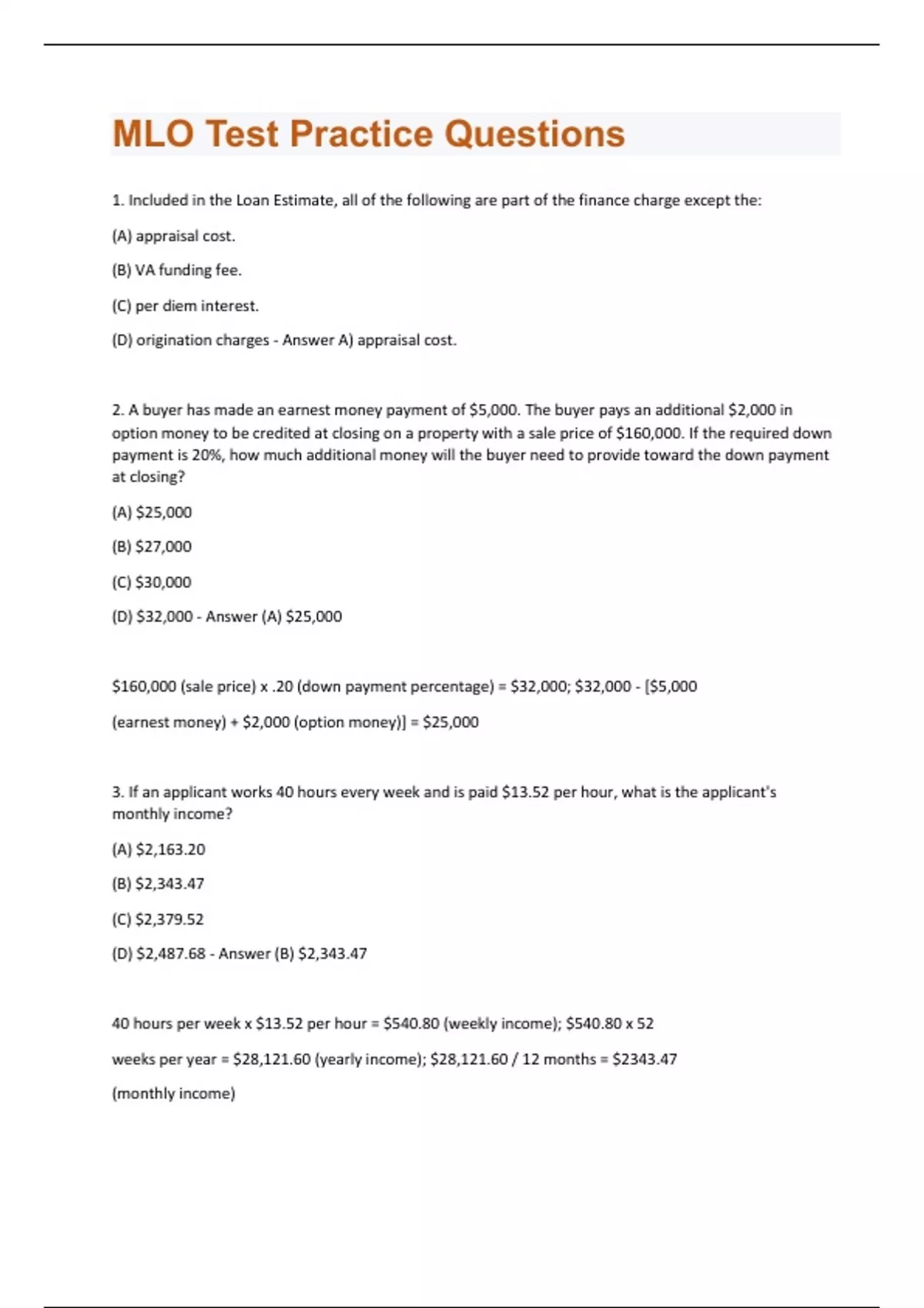 1. Included in the Loan Estimate, all of the following are part of the finance charge except the: (A) appraisal cost. (B) VA funding fee. (C) per diem interest. (D) origination charges - Answer A) appraisal cost. 2. A buyer has made an earnest money payment of $5,000. The buyer pays an additional $2,000 in option money to be credited at closing on a property with a sale price of $160,000. If the required down payment is 20%, how much additional money will the buyer need to provide toward the down payment at closing? (A) $25,000 (B) $27,000 (C) $30,000 (D) $32,000 - Answer (A) $25,000 $160,000 (sale price) x .20 (down payment percentage) = $32,000; $32,000 - [$5,000 (earnest money) + $2,000 (option money)] = $25,000 3. If an applicant works 40 hours every week and is paid $13.52 per hour, what is the applicant's monthly income? (A) $2,163.20 (B) $2,343.47 (C) $2,379.52 (D) $2,487.68 - Answer (B) $2,343.47 40 hours per week x $13.52 per hour = $540.80 (weekly income); $540.80 x 52 weeks per year = $28,121.60 (yearly income); $28,121.60 / 12 months = $2343.47 (monthly income)4. The requirement for private mortgage insurance (PMI) is generally discontinued when the loan-tovalue ratio falls below: (A) 20%. (B) 50%. (C) 80%. (D) 90%. - Answer (C) 80%. 5. The unique identifier of any personal originating residential loan must be clearly shown on all of the following documents except: (A) business cards. (B) company websites. (C) residential mortgage loan application form. (D) Consumer Financial Protection Bureau (CFPB) special information booklet. - Answer (D) Consumer Financial Protection Bureau (CFPB) special information booklet. 6. According to the Truth-in-Lending Act (TILA), the term "refinance" applies to: (A) a reduction in APR. (B) a change in a payment schedule. (C) the renewal of a single payment obligation with no change in the original terms. (D) the satisfaction of an existing obligation and its replacement by a new obligation - Answer (D) the satisfaction of an existing obligation and its replacement by a new obligation 7. Which of the following documents does a mortgage loan originator use to determine the estimated value of a property based on an analytical comparison of similar property sales? (A) An appraisal (B) An area survey (C) A market survey (D) A cost-benefit analysis - Answer (A) An appraisal