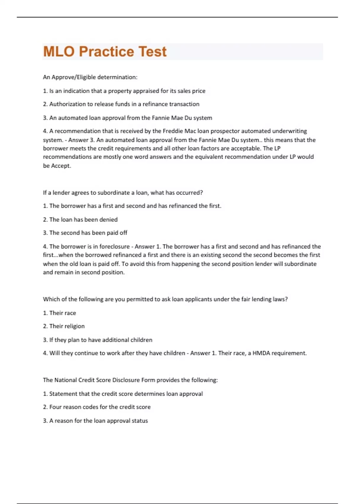 An Approve/Eligible determination: 1. Is an indication that a property appraised for its sales price 2. Authorization to release funds in a refinance transaction 3. An automated loan approval from the Fannie Mae Du system 4. A recommendation that is received by the Freddie Mac loan prospector automated underwriting system. - Answer 3. An automated loan approval from the Fannie Mae Du system.. this means that the borrower meets the credit requirements and all other loan factors are acceptable. The LP recommendations are mostly one word answers and the equivalent recommendation under LP would be Accept. If a lender agrees to subordinate a loan, what has occurred? 1. The borrower has a first and second and has refinanced the first. 2. The loan has been denied 3. The second has been paid off 4. The borrower is in foreclosure - Answer 1. The borrower has a first and second and has refinanced the first...when the borrowed refinanced a first and there is an existing second the second becomes the first when the old loan is paid off. To avoid this from happening the second position lender will subordinate and remain in second position. Which of the following are you permitted to ask loan applicants under the fair lending laws? 1. Their race 2. Their religion 3. If they plan to have additional children 4. Will they continue to work after they have children - Answer 1. Their race, a HMDA requirement. The National Credit Score Disclosure Form provides the following: 1. Statement that the credit score determines loan approval 2. Four reason codes for the credit score 3. A reason for the loan approval status4. The reason for the loan denial - Answer 2. Four reason codes for the credit score. The income approach used in valuing property during an appraisal considers the following: 1. The replacement cost of the property 2. The average meridian income levwels of the community 3. The fair market rental earnings of similar homes 4. The qualifying income potential borrowers - Answer 3. The fair market rental earnings of similar homes A mortgage broker decides to solicit business from a previous customer who closed on a home purchase. Which action could result in a $16,000 fine? 1. Contacting the customer 17 months after the purchase transaction closed 2. Verifying that the customer is not in the no-call-registry before making a sales call 2 years after the purchase transaction closed 3. The client is listed on the company no-call list and the loan originator calls the customer just shy of 18 months after the purchase transaction closed. 4. The customer is on the no-call-register and the loan originator calls 14 months later - Answer 3. The client is listed on the company no-call list and the loan originator calls the customer just shy of 18 months after the purchase transaction closed. If the customer has requested not to be called then it is a violation to call the customer. Which of the following is not a factor in determining an interest rate? 1. Age 2. Time 3. Points 4. Margin - Answer 1. Age..age is a prohibited basis under ECOA and can't be used to determine interest rates. Points are discount fees that are charged to lower the rate, the longer the time generally higher the rate and margin is the lenders profit built into the rate Interest-only mortgages can be all of the following EXCEPT: 1. Can be fixed rate mortgages 2. Can be adjustable rate mortgages3. Can be junior liens 4. Fully amortized loans - Answer 4. Fully amortized loans..means that the amortization will pay out the loan. With interest only, payments contribute to interest only and the principal is not reduced. Which of the following would not be a penalty for violating RESPA section 8 relating to kickbacks? 1. Three times the value of the referral relating to the kickback and/or unearned fees. 2. The attorneys fees for the affected person 3. The affected person would have the right to rescind the loan transaction 4. A $10,000 fine and/or 1 year in prison for each violation. - Answer 3. The affected person would have the right to rescind the loan transaction..civil & criminal liability is provided for violating the prohibition against kickbacks and unearned fees, including: *Civil liability to the parties affected, equal to three times the amount of the referral fee, kickback and/or unearned fee*. *The possibility that the costs associated with any court proceeding and reasonable attorneys fees could be recovered*. *a fine of no more than $10,000 or imprisonment for no more than 1 year or both, for each violation.