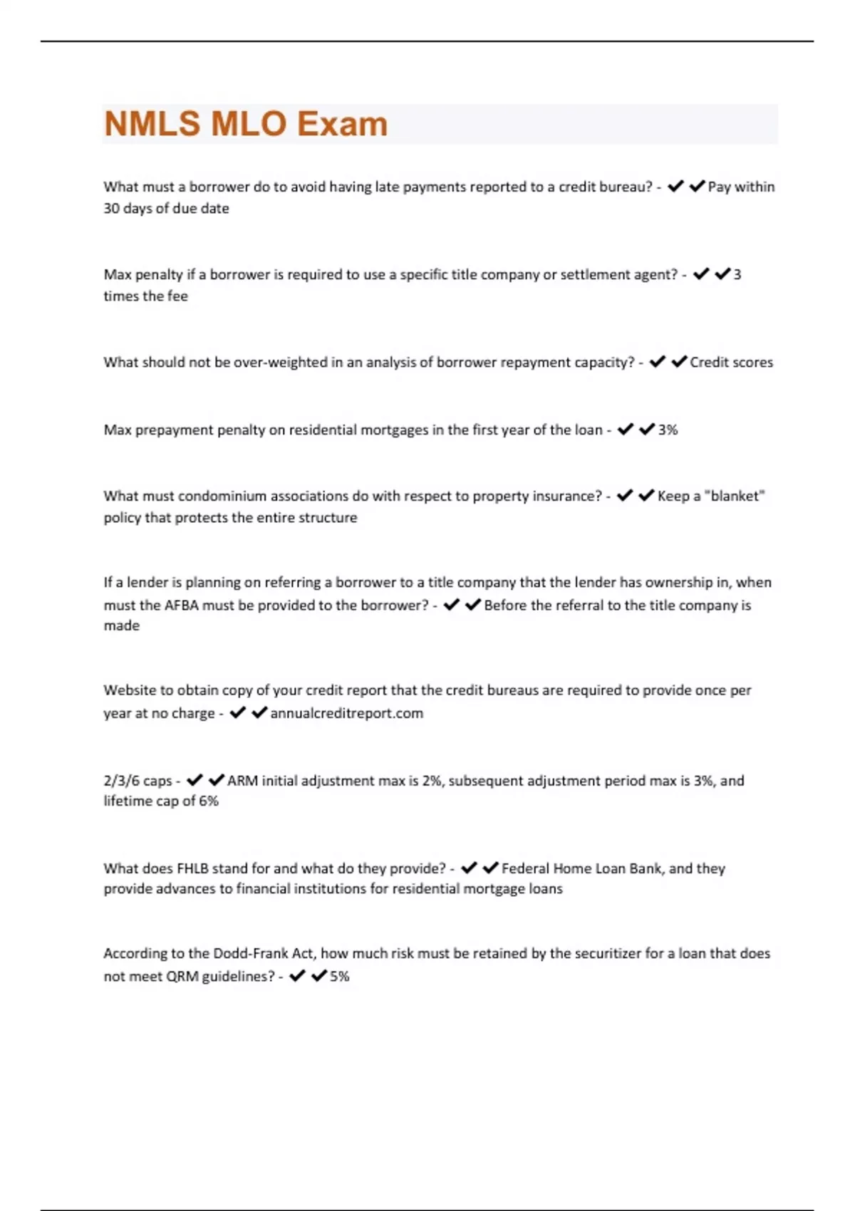 What must a borrower do to avoid having late payments reported to a credit bureau? - Pay within 30 days of due date Max penalty if a borrower is required to use a specific title company or settlement agent? - 3 times the fee What should not be over-weighted in an analysis of borrower repayment capacity? - Credit scores Max prepayment penalty on residential mortgages in the first year of the loan - 3% What must condominium associations do with respect to property insurance? - Keep a "blanket" policy that protects the entire structure If a lender is planning on referring a borrower to a title company that the lender has ownership in, when must the AFBA must be provided to the borrower? -Before the referral to the title company is made Website to obtain copy of your credit report that the credit bureaus are required to provide once per year at no charge - 2/3/6 caps - ARM initial adjustment max is 2%, subsequent adjustment period max is 3%, and lifetime cap of 6% What does FHLB stand for and what do they provide? - Federal Home Loan Bank, and they provide advances to financial institutions for residential mortgage loans According to the Dodd-Frank Act, how much risk must be retained by the securitizer for a loan that does not meet QRM guidelines? - 5%On a purchase transaction, what document contains the purchase price for a property? - Sales Contract After a loan has been closed and funded, the creditor notices a tolerance violation with a fee between the LE and CD. How long does the creditor have to reimburse the borrower for the overcharge before being considered in violation of the TRID rule? - 60 days after closing According to the Dodd-Frank Act, how much risk must be retained by the securitizer for a loan that does not meet QRM guidelines? - 5% Overt Discrimination - Refusing service to anyone of a certain race, ethnicity, etc. Under ECOA can you ask how many children a borrower has? - No What document specifies that a property is being used as security in the event of nonpayment of a debt? - Mortgage On the LE, which piece of data tells applicants how much they will be paying in interest over the life of the loan as a percentage of the loan? - TIP (Total Interest Percentage) COFI comes from what region in the country? - The 11th Federal Home Loan Bank (Arizona, California, and Nevada) What disclosure is required to be provided to the applicant within 3 days of application under reg x? - Mortgage Loan Servicing Disclosure Verification of cash used in a closing is documented by: - last 2-3 months bank statements The finance charge is the total cost of: - the loan in dollars, including points and mortgage insuranceWhat IRS forms would you requrest from a borrower who is 40% shareholder in a C-Corporation? - Form 1120