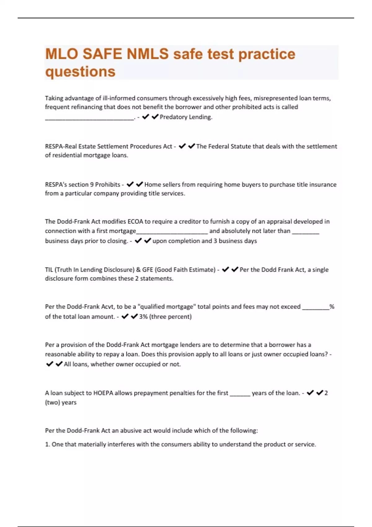 Taking advantage of ill-informed consumers through excessively high fees, misrepresented loan terms, frequent refinancing that does not benefit the borrower and other prohibited acts is called __________________________. - Predatory Lending. RESPA-Real Estate Settlement Procedures Act - The Federal Statute that deals with the settlement of residential mortgage loans. RESPA's section 9 Prohibits - Home sellers from requiring home buyers to purchase title insurance from a particular company providing title services. The Dodd-Frank Act modifies ECOA to require a creditor to furnish a copy of an appraisal developed in connection with a first mortgage_____________________ and absolutely not later than ________ business days prior to closing. - upon completion and 3 business days TIL (Truth In Lending Disclosure) & GFE (Good Faith Estimate) - Per the Dodd Frank Act, a single disclosure form combines these 2 statements. Per the Dodd-Frank Acvt, to be a "qualified mortgage" total points and fees may not exceed ________% of the total loan amount. - 3% (three percent) Per a provision of the Dodd-Frank Act mortgage lenders are to determine that a borrower has a reasonable ability to repay a loan. Does this provision apply to all loans or just owner occupied loans? - All loans, whether owner occupied or not. A loan subject to HOEPA allows prepayment penalties for the first ______ years of the loan. - 2 (two) years Per the Dodd-Frank Act an abusive act would include which of the following: 1. One that materially interferes with the consumers ability to understand the product or service.2. One that take unreasonable advantage of a consumers' lack of understanding. 3. One that takes unreasonable advantage of the consumer's reasonable reliance on the MLO. - All three would be considered abusive acts. Per the Dodd-Frank Act if an MLO receives compensation directly from a consumer, up to how much additional compensation may be received from a lender in the same transaction? - $0.00, dual compensation is not allowed. Compensation must be borrower paid or lender paid. What kinds of reasons are necessary for a lender to take adverse action with regard to a borrower? - Specific reasons. Adverse action means ______________________. - A denial or revocation of credit. Also, a change in the terms of an existing credit arrangement or a refusal to grant credit in substantially the amount or terms requested. Per Regulation B, Lenders should retain certain records for _____________ months. - 25 Months Because of the impact of the Dodd-Frank Act on a second mortgage, an APR that exceeds the ________ by more than _____% is the trigger that defines a high cost loan. - APOR ( Average Prime Offer Rate), 8.5% Regulation C is known as ________________________. - HMDA, The Home Mortgage Disclosure Act. What is the purpose of HMDA? - The HMDA determines whether financial institutions are serving the housing needs of their communities. It also identifies patterns of discriminatory lending. Under what circumstances can a lender with an Affiliated Business Arrangement require a borrower to use a specific third party service provider? - If there are no kickback or referral fees and the service provider is an attorney, credit reporting agency or appraiser the lender can require that the borrower uses the providerIf a transfer of servicing occurs, the _______________ must provide a servicing transfer statement not less than ________ days before the transfer occurs. - Servicer, 15 (fifteen) days. An individual who fails the MLO written exam 3 times must wait _________ months to retake the exam. - 6 (Six) Months Per RESPA, an annual escrow statement is required to ______________. - determine shortages and surpluses in the escrow account.
