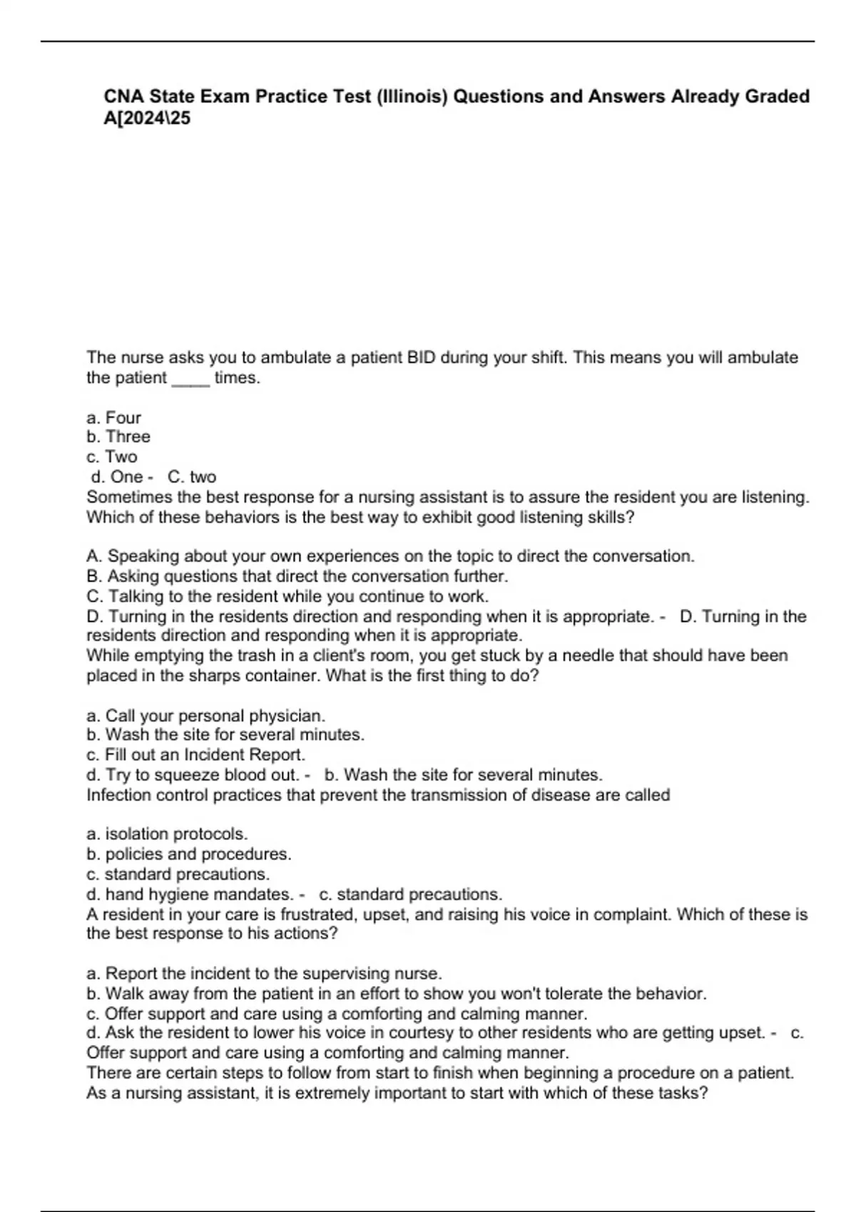 The nurse asks you to ambulate a patient BID during your shift. This means you will ambulate the patient ____ times. a. Four b. Three c. Two d. One - C. two Sometimes the best response for a nursing assistant is to assure the resident you are listening. Which of these behaviors is the best way to exhibit good listening skills? A. Speaking about your own experiences on the topic to direct the conversation. B. Asking questions that direct the conversation further. C. Talking to the resident while you continue to work. D. Turning in the residents direction and responding when it is appropriate. - D. Turning in the residents direction and responding when it is appropriate. While emptying the trash in a client's room, you get stuck by a needle that should have been placed in the sharps container. What is the first thing to do? a. Call your personal physician. b. Wash the site for several minutes. c. Fill out an Incident Report. d. Try to squeeze blood out. - b. Wash the site for several minutes. Infection control practices that prevent the transmission of disease are called a. isolation protocols. b. policies and procedures. c. standard precautions. d. hand hygiene mandates. - c. standard precautions. A resident in your care is frustrated, upset, and raising his voice in complaint. Which of these is the best response to his actions?