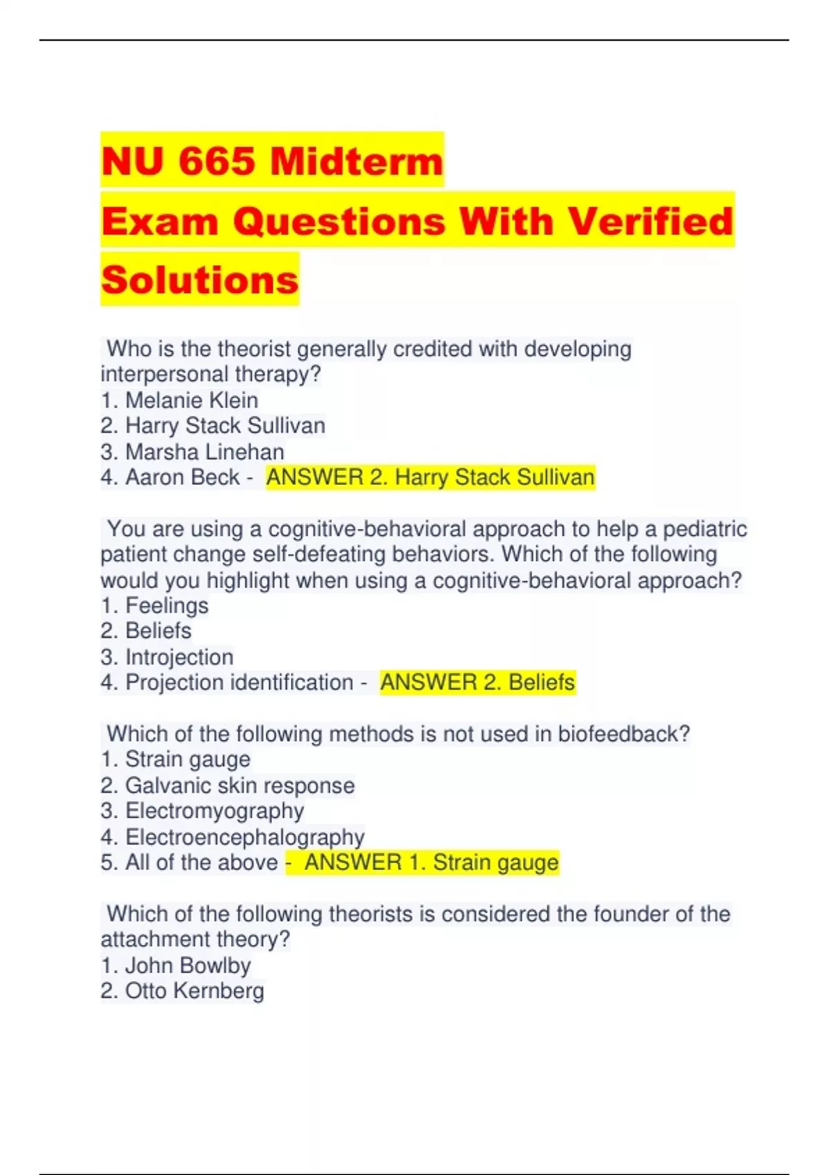 NU 665 Midterm Exam Questions With Verified Solutions Who is the theorist generally credited with developing interpersonal therapy? 1. Melanie Klein 2. Harry Stack Sullivan 3. Marsha Linehan 4. Aaron Beck - ANSWER 2. Harry Stack Sullivan You are using a cognitive-behavioral approach to help a pediatric patient change self-defeating behaviors. Which of the following would you highlight when using a cognitive-behavioral approach? 1. Feelings 2. Beliefs 3. Introjection 4. Projection identification - ANSWER 2. Beliefs Which of the following methods is not used in biofeedback? 1. Strain gauge 2. Galvanic skin response 3. Electromyography 4. Electroencephalography 5. All of the above - ANSWER 1. Strain gauge Which of the following theorists is considered the founder of the attachment theory? 1. John Bowlby 2. Otto Kernberg 3. Melanie Klein 4. Heinz Kohut 5. Adolf Meyer - ANSWER 1. John Bowlby American psychologist Edward L Thorndike described 1. Drive reduction theory 2. Trial and error learning 3. Respondent behavior 4. Behaviorism 5. Operant behavior - ANSWER 2. Trial and error learning Attachment theory states that 1. Infants are generally polytropic in their attachments 2. Attachment disorders may lead to failure to thrive 3. Attachment occurs instantaneously between the mother and the child 4. Attachment is synonymous with bonding 5. Separation anxiety is most common when an infant is 5 months old - ANSWER 2. Attachment disorders may lead to failure to thrive According to Prochaska and DiClemente Change Theory, at what stage of change would ambivalence be evident? 1. Contemplation 2. Action 3. Denial 4. Precontemplation - ANSWER 1. Contemplation As a practicing PMHNP you diagnose a patient with polysubstance dependence and decide to proceed with motivational interviewing (MI). MI incorporates all of the following principles EXCEPT 1. Expressing empathy 2. Giving advice 3. Developing discrepancy 4. Rolling with resistance 5. Supporting self-efficacy - ANSWER 2. Giving advice Match the following statement with the appropriate leadership skill term: To let clients know they are heard and understood beyond the level of words require 1. Active listening 2. Restating 3. Clarifying 4. Empathizing 5. Reflecting feelings - ANSWER 5. Reflecting feelings Several communication styles are key to the spirit of MI. Select the one that is the most likely to contribute to resistance. 1. Guiding 2. Focusing 3. Following 4. Directing - ANSWER 4. Directing The PMHNP knows that an essential component embed