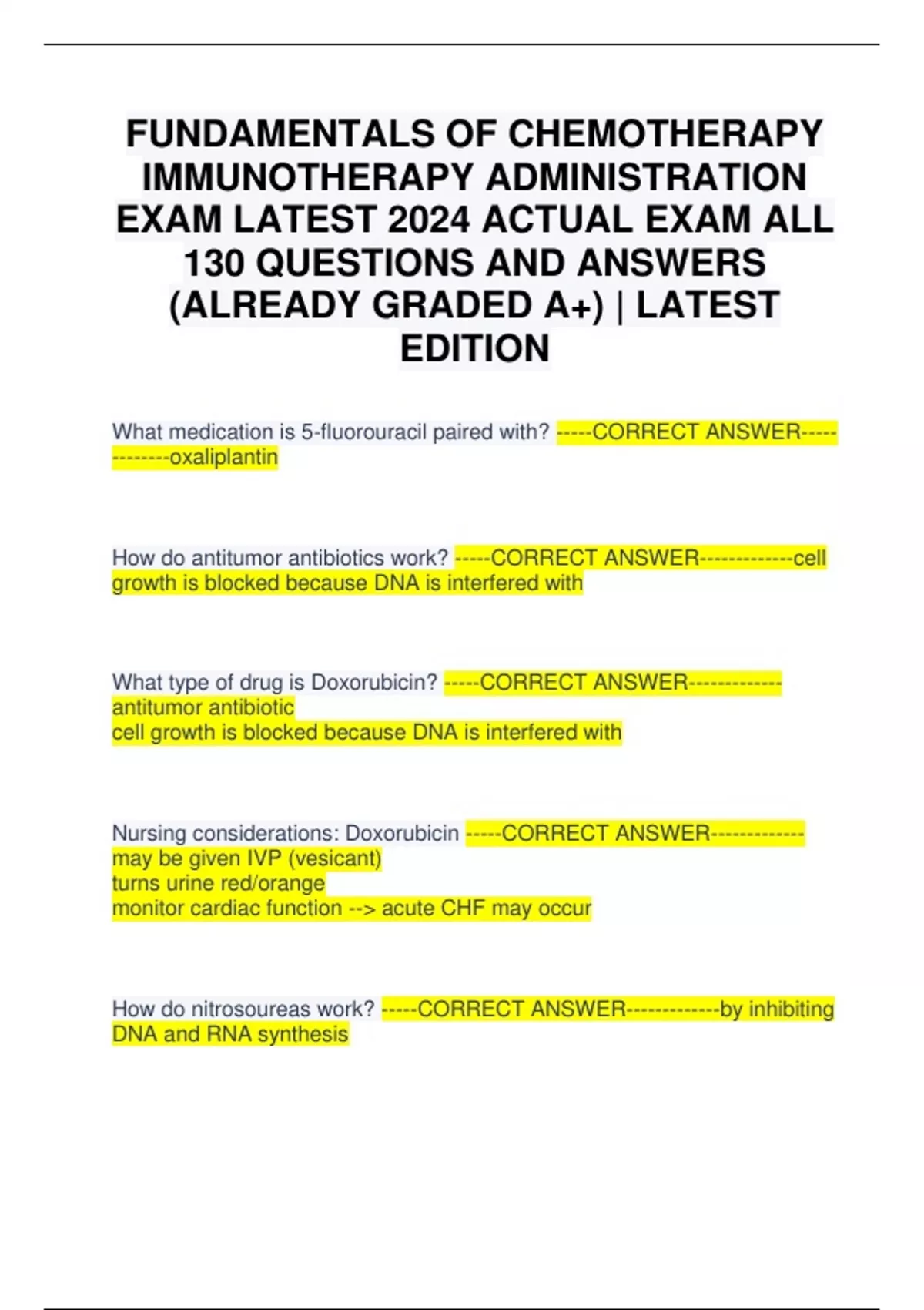 FUNDAMENTALS OF CHEMOTHERAPY IMMUNOTHERAPY ADMINISTRATION EXAM LATEST 2024 ACTUAL EXAM ALL 130 QUESTIONS AND ANSWERS (ALREADY GRADED A+) | LATEST EDITION