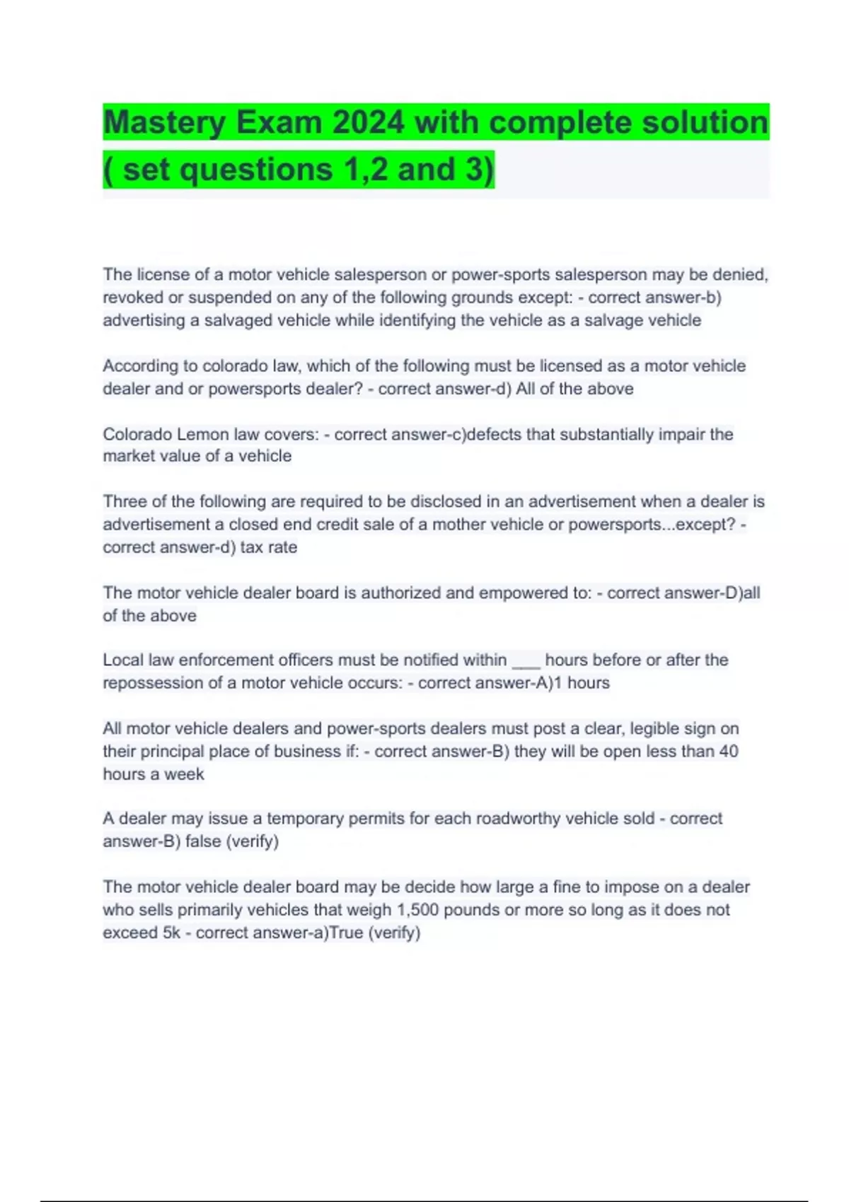 mastery exam 2024 with complete solution set que