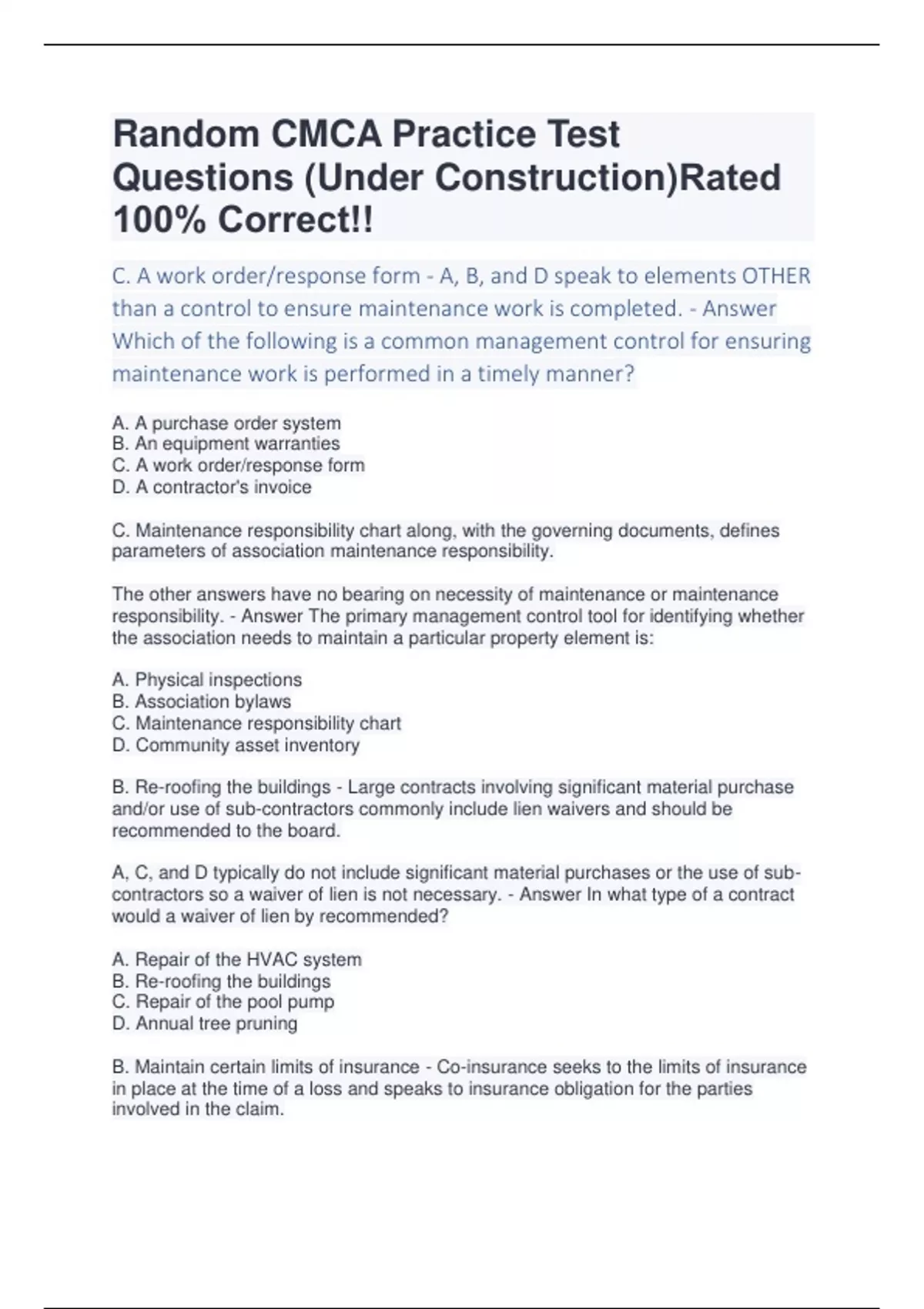 C. A work order/response form - A, B, and D speak to elements OTHER than a control to ensure maintenance work is completed. - Answer Which of the following is a common management control for ensuring maintenance work is performed in a timely manner? A. A purchase order system B. An equipment warranties C. A work order/response form D. A contractor's invoice C. Maintenance responsibility chart along, with the governing documents, defines parameters of association maintenance responsibility. The other answers have no bearing on necessity of maintenance or maintenance responsibility. - Answer The primary management control tool for identifying whether the association needs to maintain a particular property element is: A. Physical inspections B. Association bylaws C. Maintenance responsibility chart D. Community asset inventory B. Re-roofing the buildings - Large contracts involving significant material purchase and/or use of sub-contractors commonly include lien waivers and should be recommended to the board. A, C, and D typically do not include significant material purchases or the use of subcontractors so a waiver of lien is not necessary. - Answer In what type of a contract would a waiver of lien by recommended? A. Repair of the HVAC system B. Re-roofing the buildings C. Repair of the pool pump D. Annual tree pruning B. Maintain certain limits of insurance - Co-insurance seeks to the limits of insurance in place at the time of a loss and speaks to insurance obligation for the parties involved in the claim.Co-insurance does not obligate the Association to pay a deductible. Provides no obligation to provide insurance for homeowners. - Answer What does "Co-Insurance" obligate the Association to do? A. Pay the deductible B. Maintain certain limits of insurance C. Cover the depreciated value of all association buildings D. Provide insurance for homeowners A. Negotiate contracts within the bidding process. Incorrect Answers: B. Employment practices liability insurance is typically purchased by an association that has employees to provide coverage against certain types of claims by those employees, and usually accompanies a workers compensation insurance policy. C. The association MUST NEVER assume that contractors carry their own insurance coverage and should require all contractors to provide evidence of insurance. D. D&O insurance policies is designed to pay for wrongful acts that do not lead to property damage (PD), bodily injury (BI), personal injury (PI), or advertising injury (AI); an example of a claim f