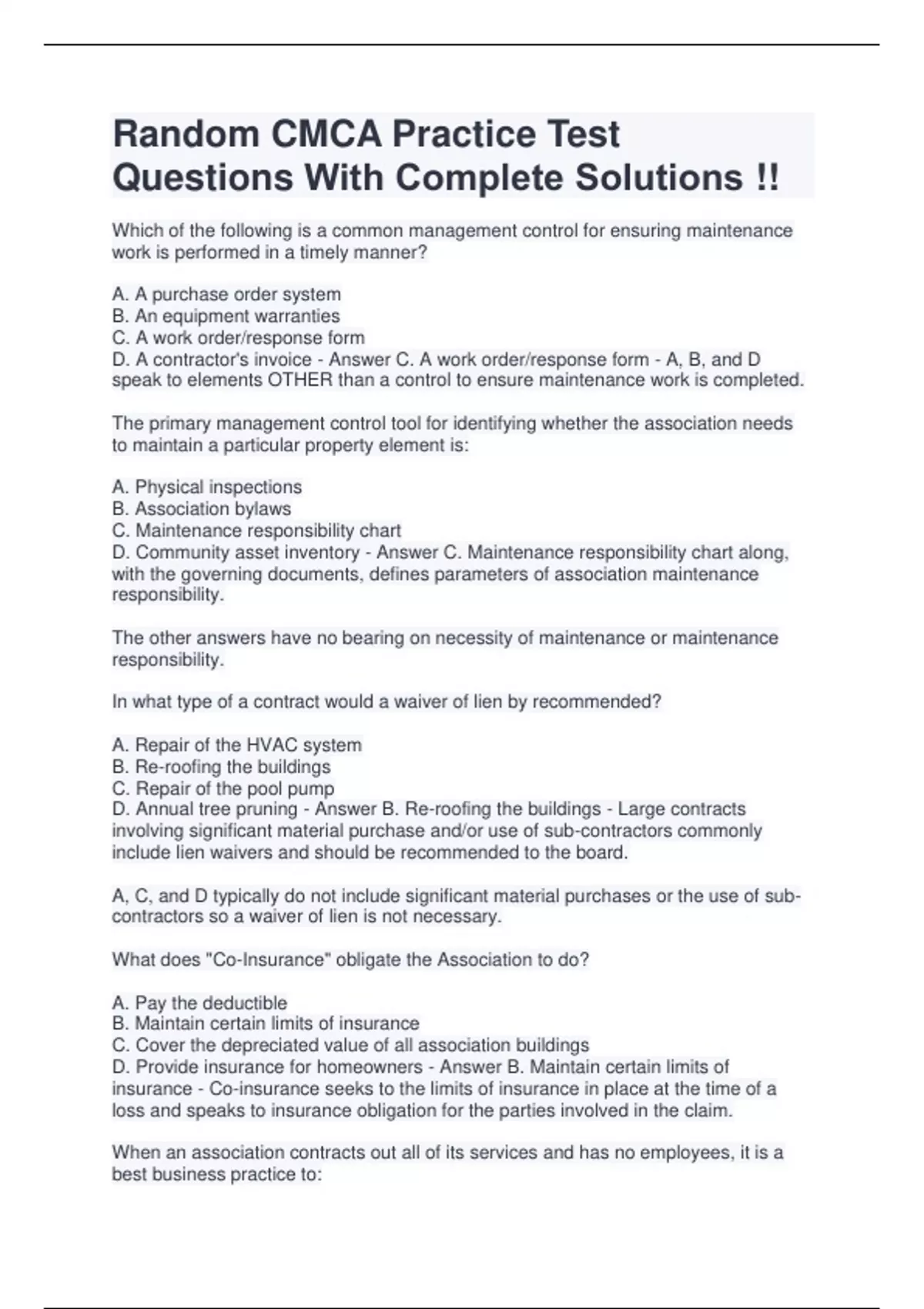 Which of the following is a common management control for ensuring maintenance work is performed in a timely manner? A. A purchase order system B. An equipment warranties C. A work order/response form D. A contractor's invoice - Answer C. A work order/response form - A, B, and D speak to elements OTHER than a control to ensure maintenance work is completed. The primary management control tool for identifying whether the association needs to maintain a particular property element is: A. Physical inspections B. Association bylaws C. Maintenance responsibility chart D. Community asset inventory - Answer C. Maintenance responsibility chart along, with the governing documents, defines parameters of association maintenance responsibility. The other answers have no bearing on necessity of maintenance or maintenance responsibility. In what type of a contract would a waiver of lien by recommended? A. Repair of the HVAC system B. Re-roofing the buildings C. Repair of the pool pump D. Annual tree pruning - Answer B. Re-roofing the buildings - Large contracts involving significant material purchase and/or use of sub-contractors commonly include lien waivers and should be recommended to the board. A, C, and D typically do not include significant material purchases or the use of subcontractors so a waiver of lien is not necessary. What does "Co-Insurance" obligate the Association to do? A. Pay the deductible B. Maintain certain limits of insurance C. Cover the depreciated value of all association buildings D. Provide insurance for homeowners - Answer B. Maintain certain limits of insurance - Co-insurance seeks to the limits of insurance in place at the time of a loss and speaks to insurance obligation for the parties involved in the claim. When an association contracts out all of its services and has no employees, it is a best business practice to: