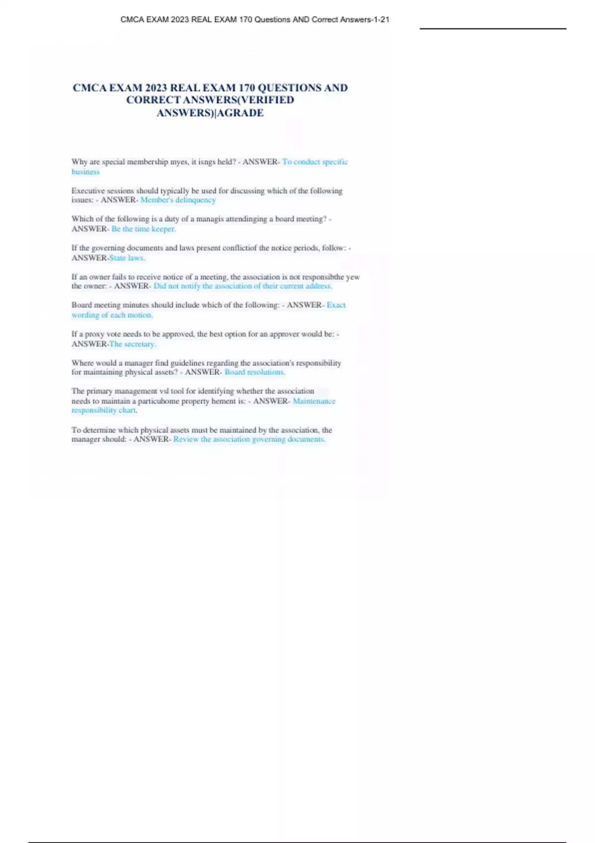 CMCA EXAM 2023 REAL EXAM 170 Questions AND Correct Answers-1-21 about:blank 1/22 CMCA EXAM 2023 REAL EXAM 170 QUESTIONS AND CORRECT ANSWERS(VERIFIED ANSWERS)|AGRADE Why are special membership myes, it isngs held? - ANSWER- To conduct specific business Executive sessions should typically be used for discussing which of the following issues: - ANSWER- Member's delinquency Which of the following is a duty of a managis attendinging a board meeting? - ANSWER- Be the time keeper. If the governing documents and laws present conflictiof the notice periods, follow: - ANSWER-State laws. If an owner fails to receive notice of a meeting, the association is not responsibthe yew the owner: - ANSWER- Did not notify the association of their current address. Board meeting minutes should include which of the following: - ANSWER- Exact wording of each motion. If a proxy vote needs to be approved, the best option for an approver would be: - ANSWER-The secretary. Where would a manager find guidelines regarding the association's responsibility for maintaining physical assets? - ANSWER- Board resolutions. The primary management vsl tool for identifying whether the association needs to maintain a particuhome property hement is: - ANSWER- Maintenance responsibility chart. To determine which physical assets must be maintained by the association, the manager should: - ANSWER- Review the association governing documents.11/4/23, 6:07 PM CMCA EXAM 2023 REAL EXAM 170 Questions AND Correct Answers-1-21 about:blank 2/22 Which of the following is a common management control for ensuring maintenance work is performed in a timely melse?- ANSWER- A work order/response form. When monitor antennance of an association's swimming pool, which of the following should be entered into a permanent log at regular intervals? - ANSWERChlorine level readings. Which of the following is an example of an association control system? - ANSWER- Frequent neighborhood inspections. A work order: - ANSWER- Assigns maintenance tasks. Which type of maintenance should be managed with a routine maintenance contract? - ANSWER- Cutting the grass Which method is the best alternative to increasing assessments? - ANSWERIncreasing income by charging higher user fees. When the Board reviews the proposed budget for aproof, what should it consider? - ANSWER- The financial position of the association. Wha