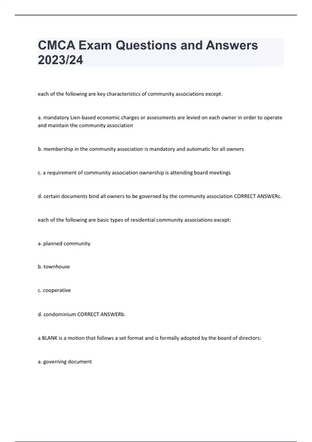 each of the following are key characteristics of community associations except: a. mandatory Lien-based economic charges or assessments are levied on each owner in order to operate and maintain the community association b. membership in the community association is mandatory and automatic for all owners c. a requirement of community association ownership is attending board meetings d. certain documents bind all owners to be governed by the community association CORRECT ANSWERc. each of the following are basic types of residential community associations except: a. planned community b. townhouse c. cooperative d. condominium CORRECT ANSWERb. a BLANK is a motion that follows a set format and is formally adopted by the board of directors: a. governing documentb. plat