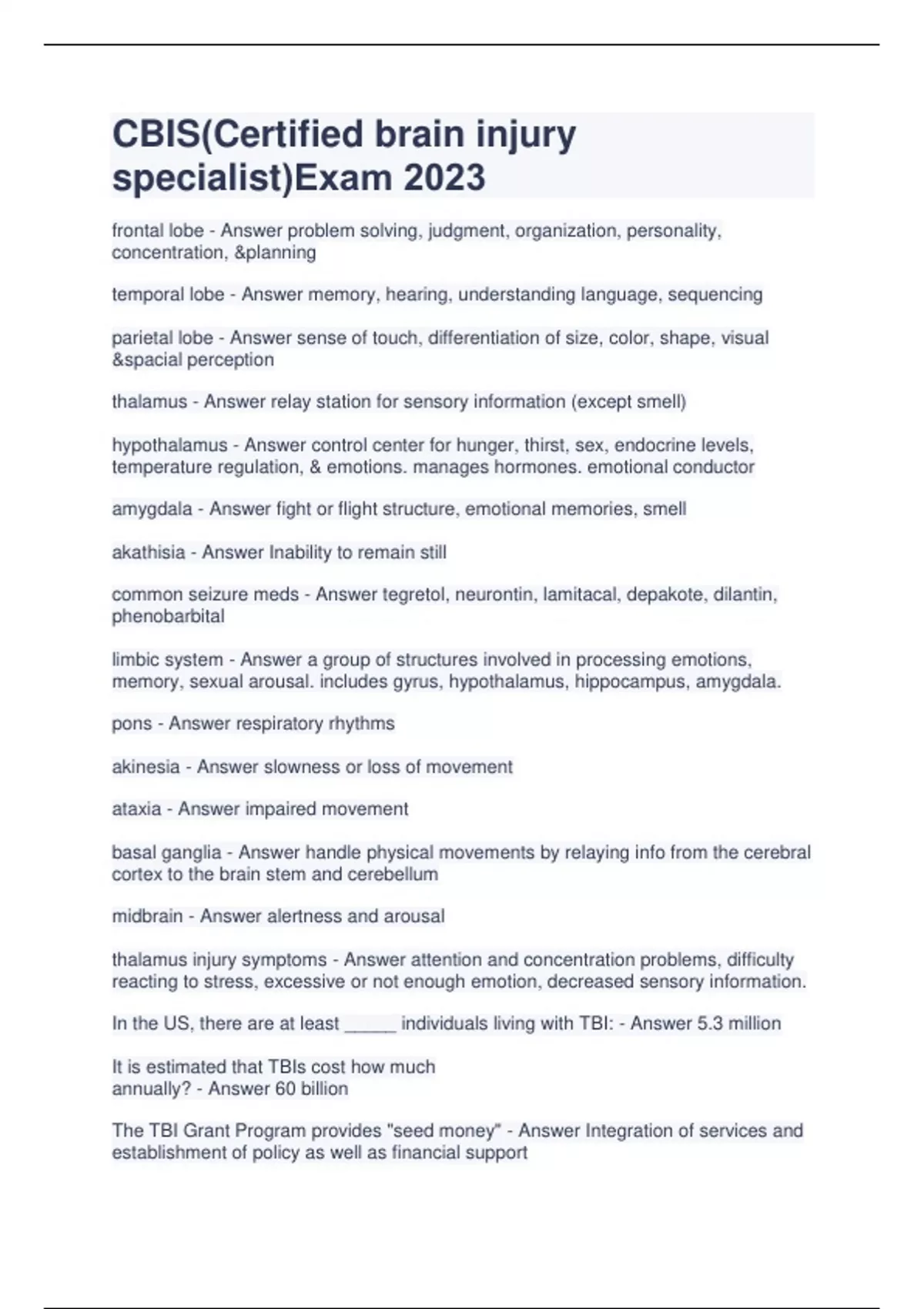 frontal lobe - Answer problem solving, judgment, organization, personality, concentration, &planning temporal lobe - Answer memory, hearing, understanding language, sequencing parietal lobe - Answer sense of touch, differentiation of size, color, shape, visual &spacial perception thalamus - Answer relay station for sensory information (except smell) hypothalamus - Answer control center for hunger, thirst, sex, endocrine levels, temperature regulation, & emotions. manages hormones. emotional conductor amygdala - Answer fight or flight structure, emotional memories, smell akathisia - Answer Inability to remain still common seizure meds - Answer tegretol, neurontin, lamitacal, depakote, dilantin, phenobarbital limbic system - Answer a group of structures involved in processing emotions, memory, sexual arousal. includes gyrus, hypothalamus, hippocampus, amygdala. pons - Answer respiratory rhythms akinesia - Answer slowness or loss of movement
