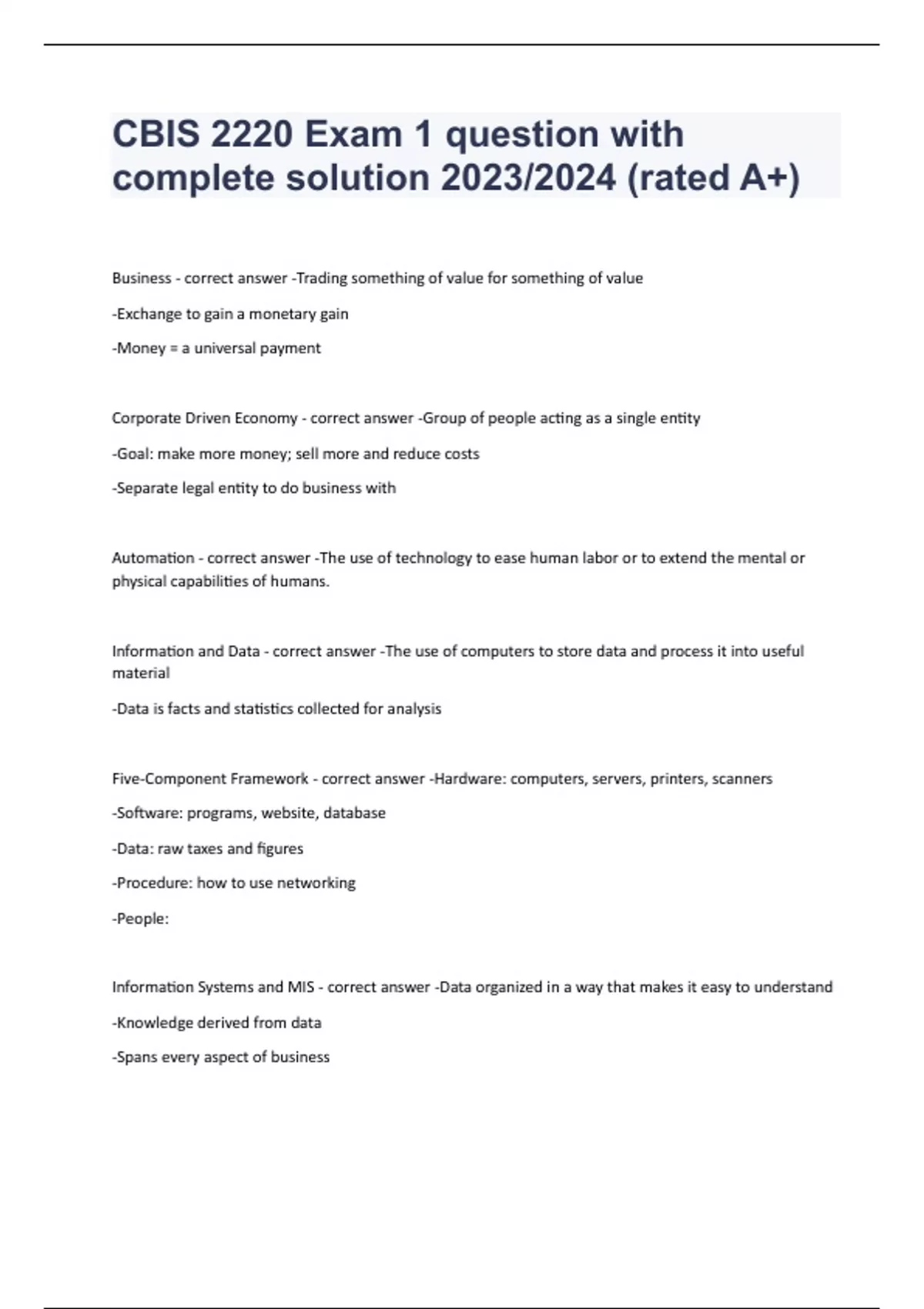 Business - correct answer -Trading something of value for something of value -Exchange to gain a monetary gain -Money = a universal payment Corporate Driven Economy - correct answer -Group of people acting as a single entity -Goal: make more money; sell more and reduce costs -Separate legal entity to do business with Automation - correct answer -The use of technology to ease human labor or to extend the mental or physical capabilities of humans. Information and Data - correct answer -The use of computers to store data and process it into useful material -Data is facts and statistics collected for analysis Five-Component Framework - correct answer -Hardware: computers, servers, printers, scanners -Software: programs, website, database -Data: raw taxes and figures -Procedure: how to use networking -People: Information Systems and MIS - correct answer -Data organized in a way that makes it easy to understand -Knowledge derived from data -Spans every aspect of business