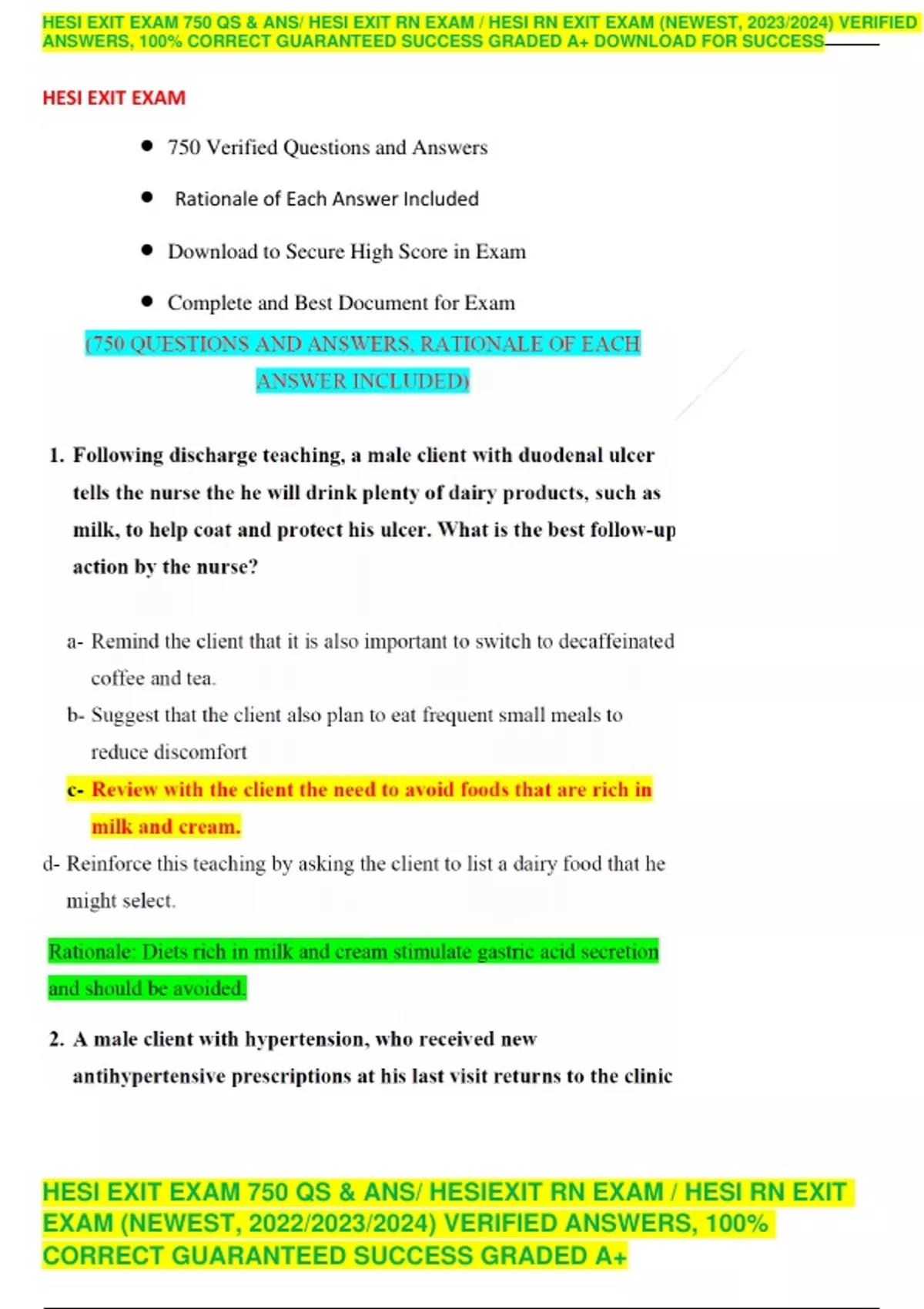 HESI EXIT EXAM 750 QS & ANS/ HESI EXIT RN EXAM / HESI RN EXIT EXAM (NEWEST, 2023/2024) VERIFIED ANSWERS, 100% CORRECT GUARANTEED SUCCESS GRADED A+ DOWNLOAD FOR SUCCESS