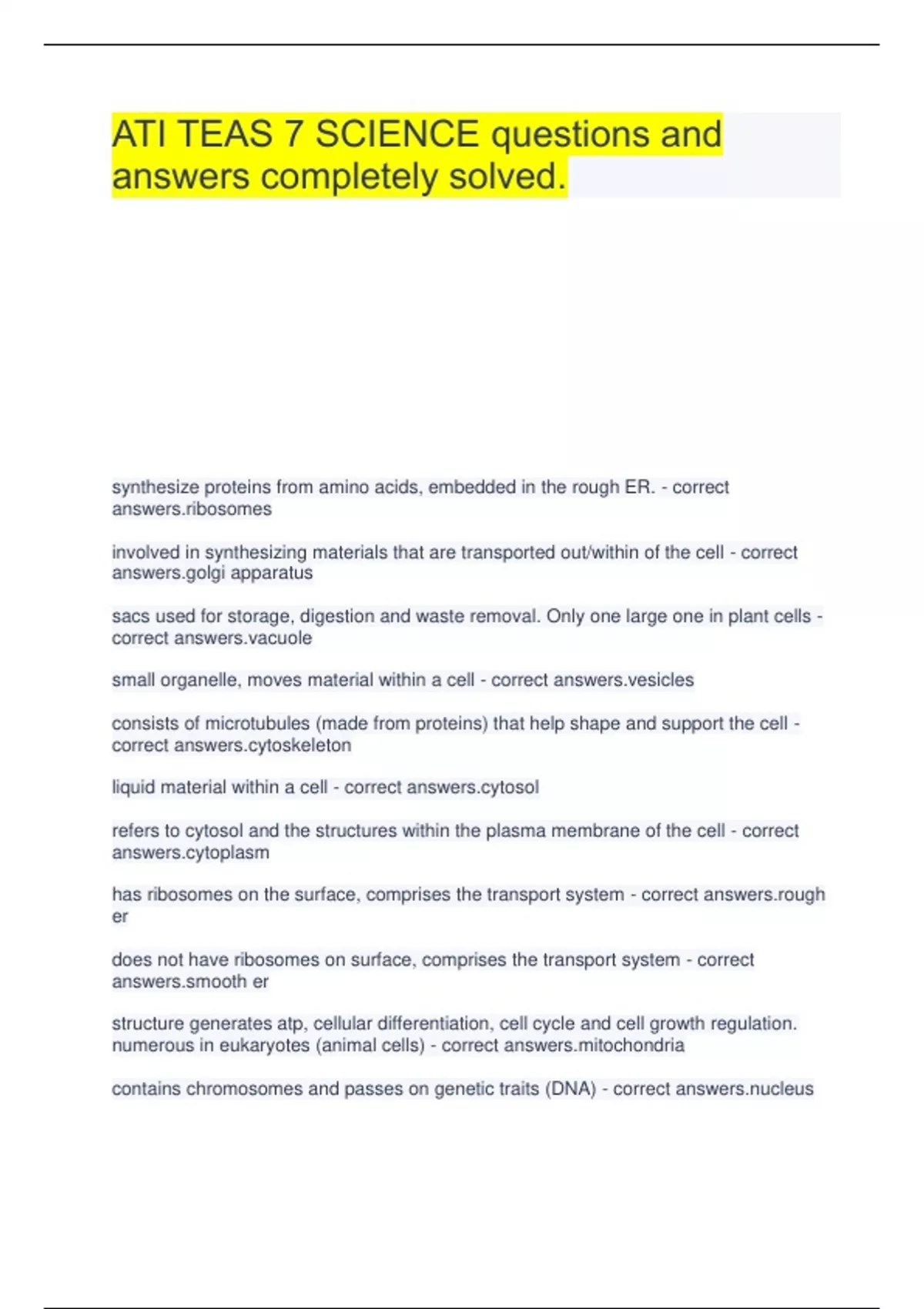 ATI TEAS 7 SCIENCE questions and answers completely solved. synthesize proteins from amino acids, embedded in the rough ER. - correct omes involved in synthesizing materials that are transported out/within of the cell - correct apparatus sacs used for storage, digestion and waste removal. Only one large one in plant cells - correct le small organelle, moves material within a cell - correct les consists of microtubules (made from proteins) that help shape and support the cell - correct keleton liquid material within a cell - correct ol refers to cytosol and the structures within the plasma membrane of the cell - correct lasm has ribosomes on the surface, comprises the transport system - correct er does not have ribosomes on surface, comprises the transport system - correct h er structure generates atp, cellular differentiation, cell cycle and cell growth regulation. numerous in eukaryotes (animal cells) - correct hondria contains chromosomes and passes on genetic traits (DNA) - correct us