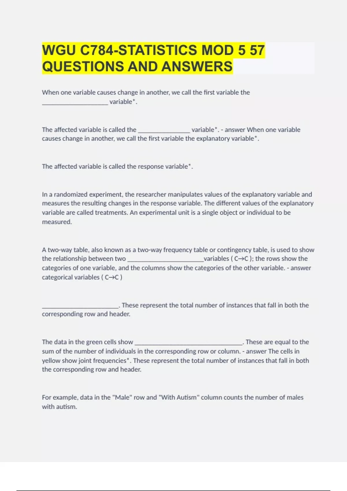 WGU C784-STATISTICS MOD 5 57 QUESTIONS AND ANSWERS When one variable causes change in another, we call the first variable the ___________________ variable*. The affected variable is called the _______________ variable*. - answer When one variable causes change in another, we call the first variable the explanatory variable*. The affected variable is called the response variable*.