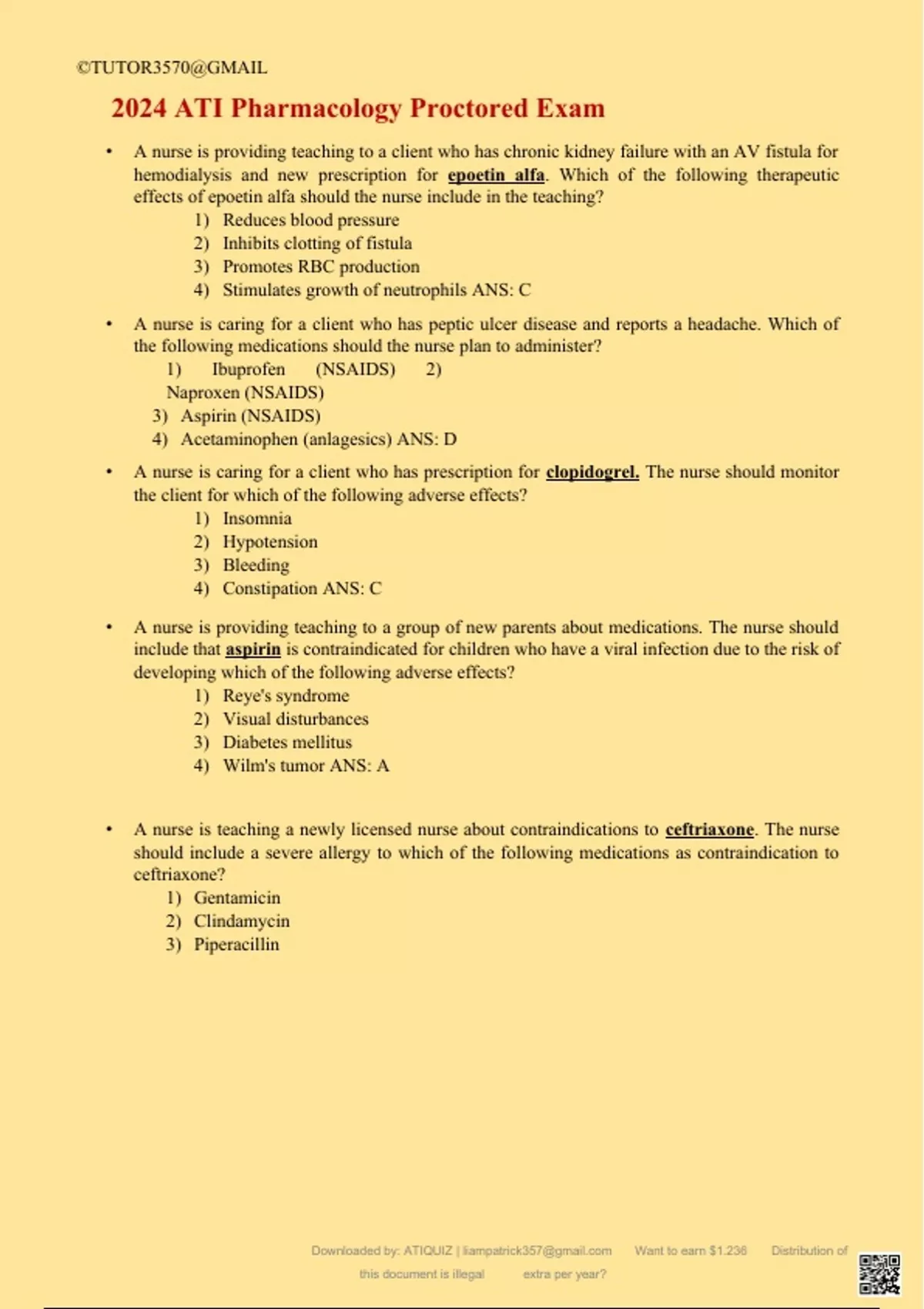 2024 ATI Pharmacology Proctored Exam • A nurse is providing teaching to a client who has chronic kidney failure with an AV fistula for hemodialysis and new prescription for epoetin alfa. Which of the following therapeutic effects of epoetin alfa should the nurse include in the teaching? 1) Reduces blood pressure 2) Inhibits clotting of fistula 3) Promotes RBC production 4) Stimulates growth of neutrophils ANS: C • A nurse is caring for a client who has peptic ulcer disease and reports a headache. Which of the following medications should the nurse plan to administer? 1) Ibuprofen (NSAIDS) 2) Naproxen (NSAIDS) 3) Aspirin (NSAIDS) 4) Acetaminophen (anlagesics) ANS: D • A nurse is caring for a client who has prescription for clopidogrel. The nurse should monitor the client for which of the following adverse effects? 1) Insomnia 2) Hypotension 3) Bleeding 4) Constipation ANS: C • A nurse is providing teaching to a group of new parents about medications. The nurse should include that aspirin is contraindicated for children who have a viral infection due to the risk of developing which of the following adverse effects? 1) Reye's syndrome 2) Visual disturbances 3) Diabetes mellitus 4) Wilm's tumor ANS: A • A nurse is teaching a newly licensed nurse about contraindications to ceftriaxone. The nurse should include a severe allergy to which of the following medications as contraindication to ceftriaxone? 1) Gentamicin 2) Clindamycin 3) Piperacillin 1 4) Sulfamethoxazole-trimethroprim